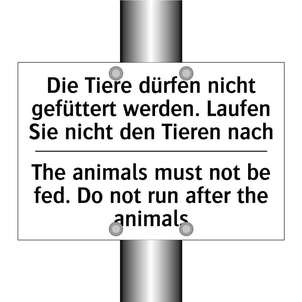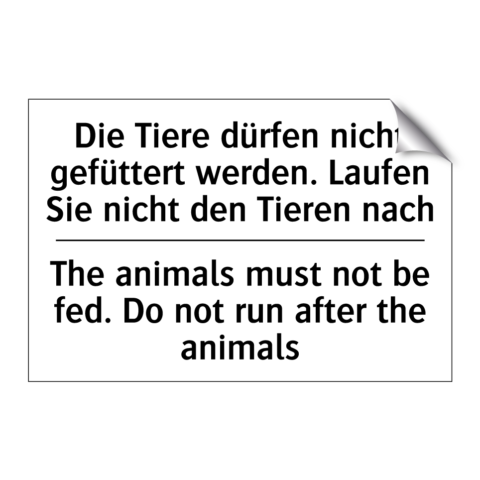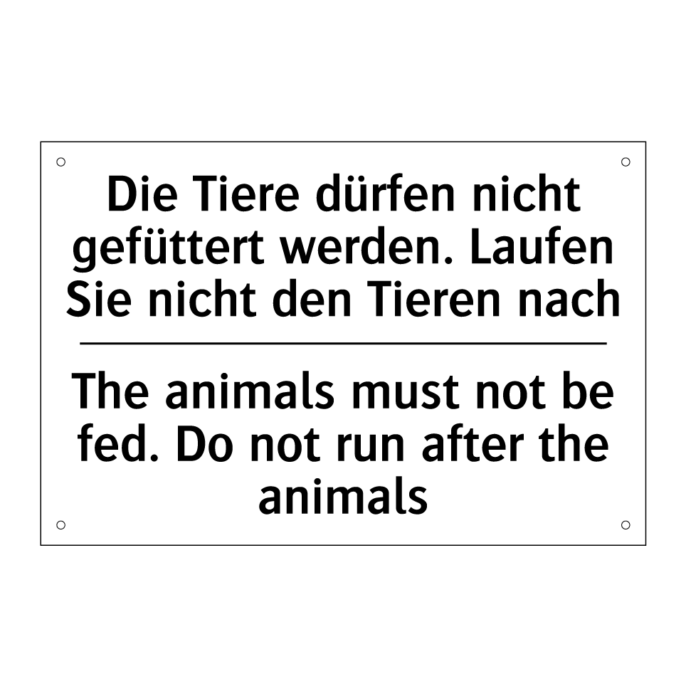 Zweisprachiges Verbotsschild mit deutschem Text Die Tiere dürfen nicht gefüttert werden. Laufen Sie nicht den Tieren nach und englischem Text The animals must not be fed. Do not run after the animals