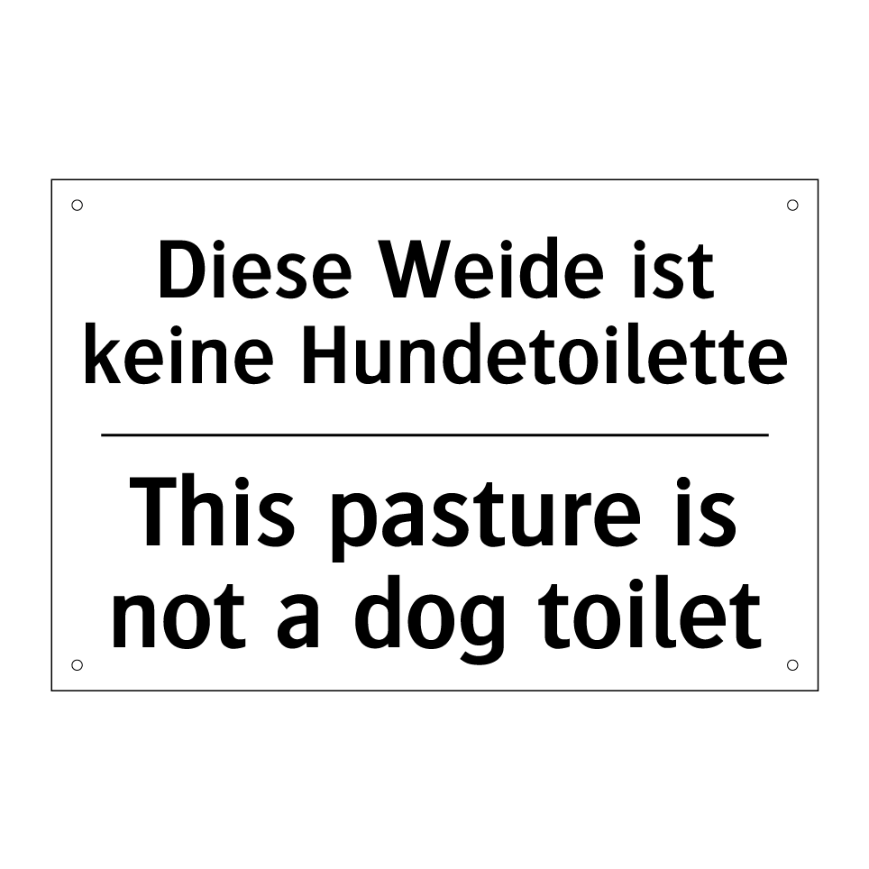 Zweisprachiges Verbotsschild mit deutschem Text Diese Weide ist keine Hundetoilette und englischem Text This pasture is not a dog toilet