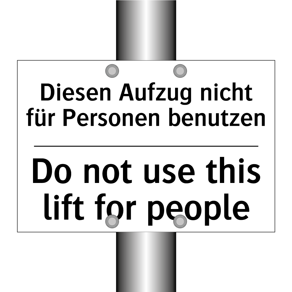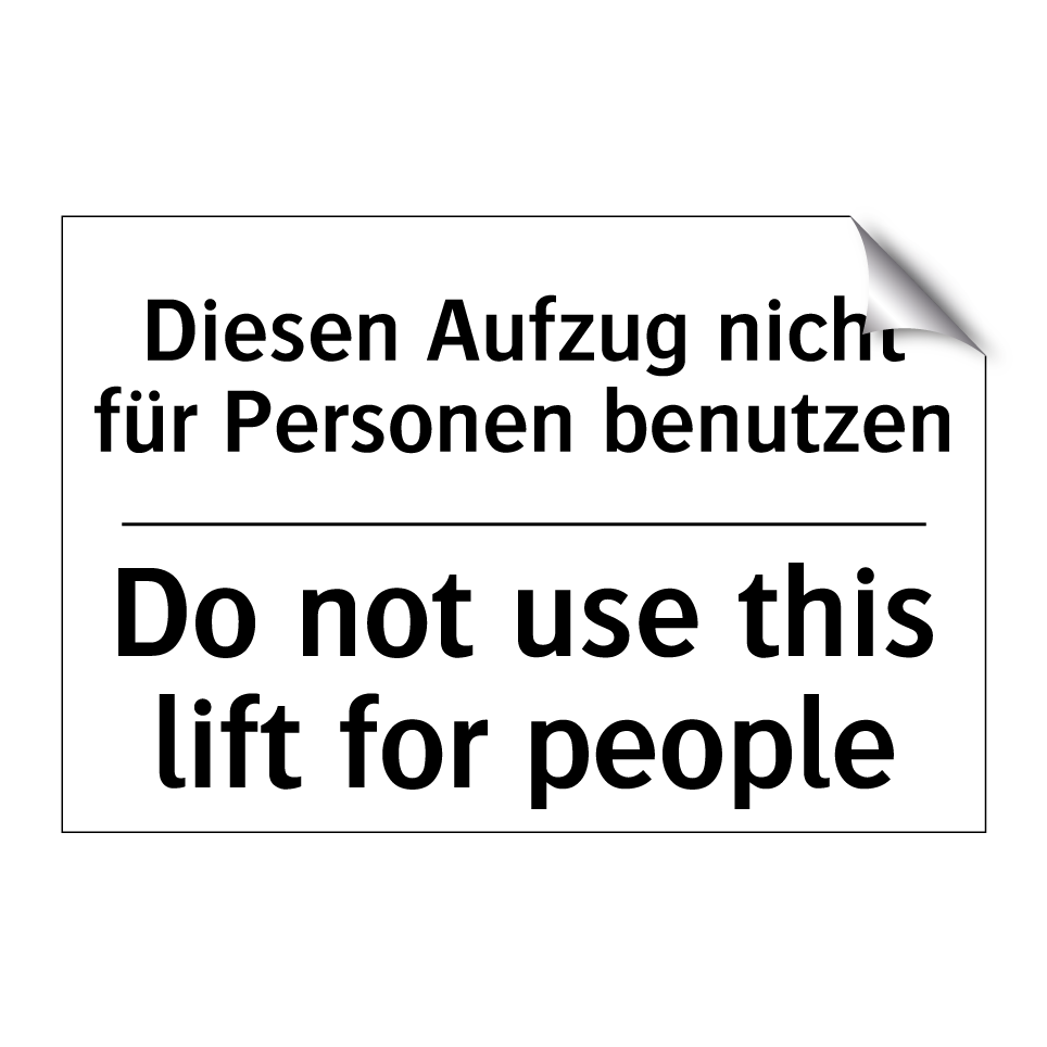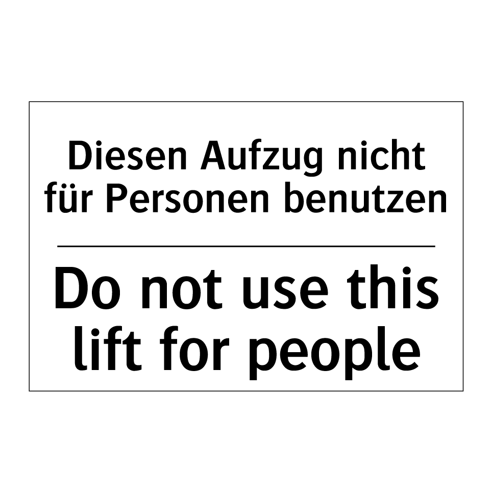 Zweisprachiges Verbotsschild mit deutschem Text Diesen Aufzug nicht für Personen benutzen und englischem Text Do not use this lift for people