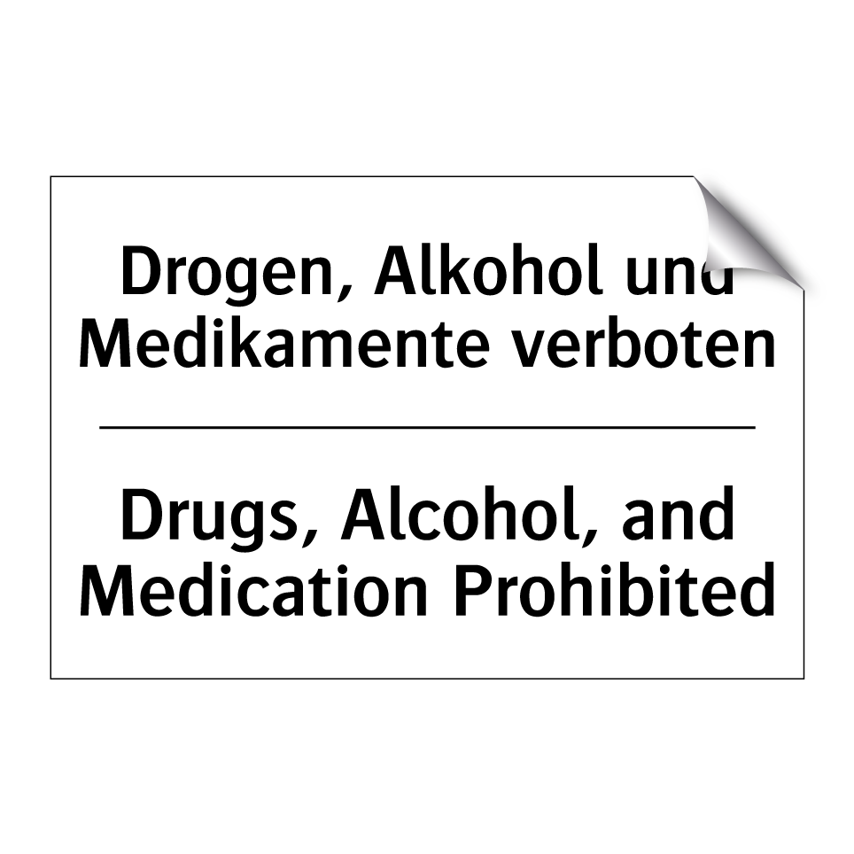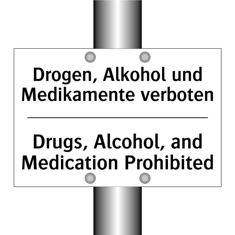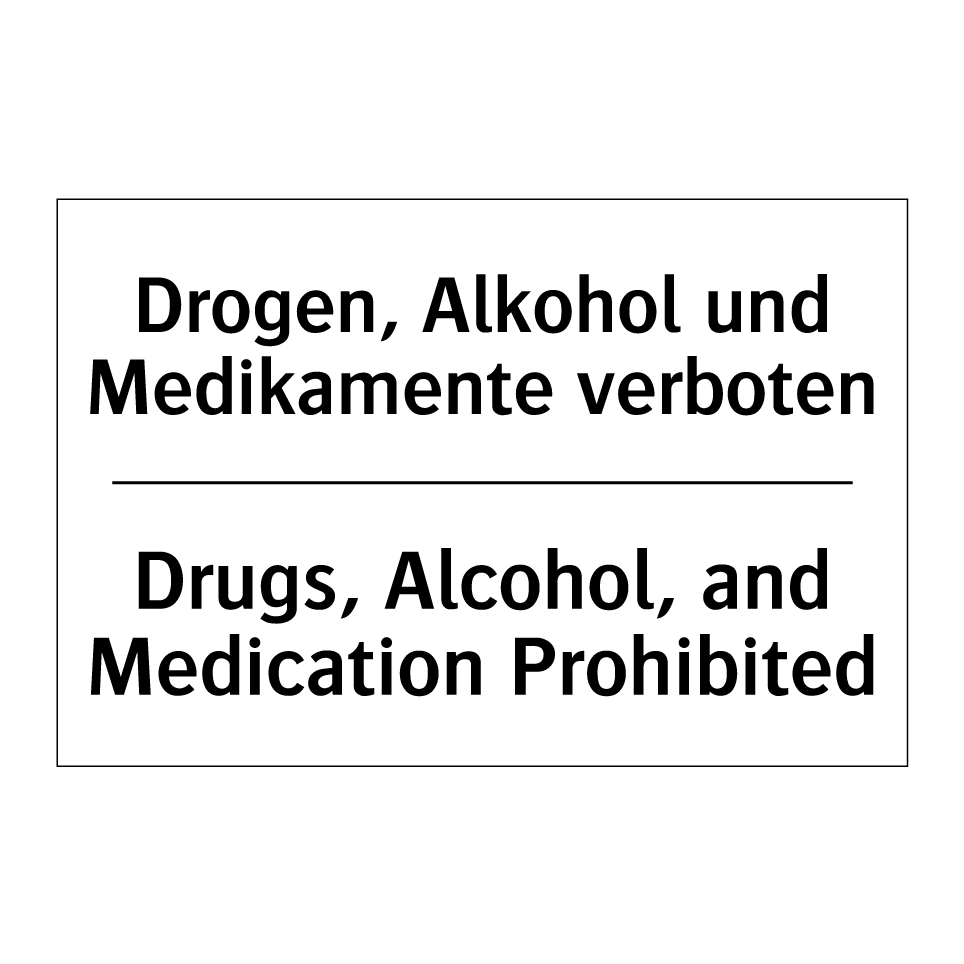 Zweisprachiges Verbotsschild mit deutschem Text Drogen, Alkohol und Medikamente verboten und englischem Text Drugs, Alcohol, and Medication Prohibited