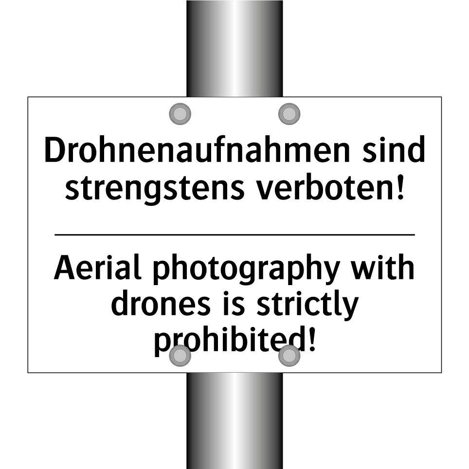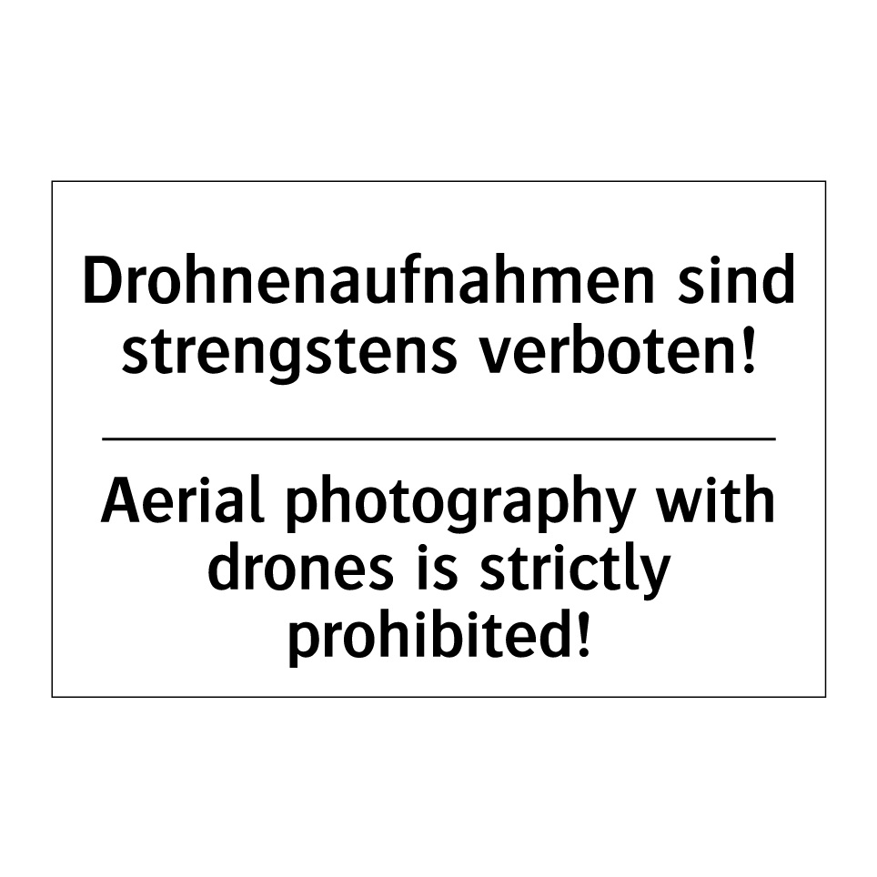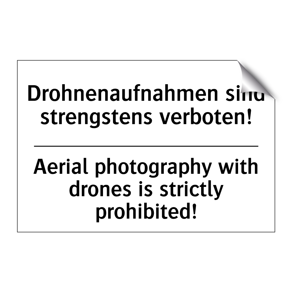 Zweisprachiges Verbotsschild mit deutschem Text Drohnenaufnahmen sind strengstens verboten! und englischem Text Aerial photography with drones is strictly prohibited!