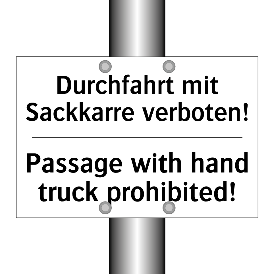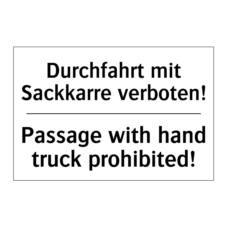 Zweisprachiges Verbotsschild mit deutschem Text Durchfahrt mit Sackkarre verboten! und englischem Text Passage with hand truck prohibited!