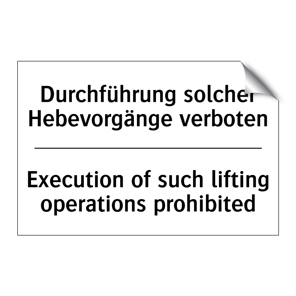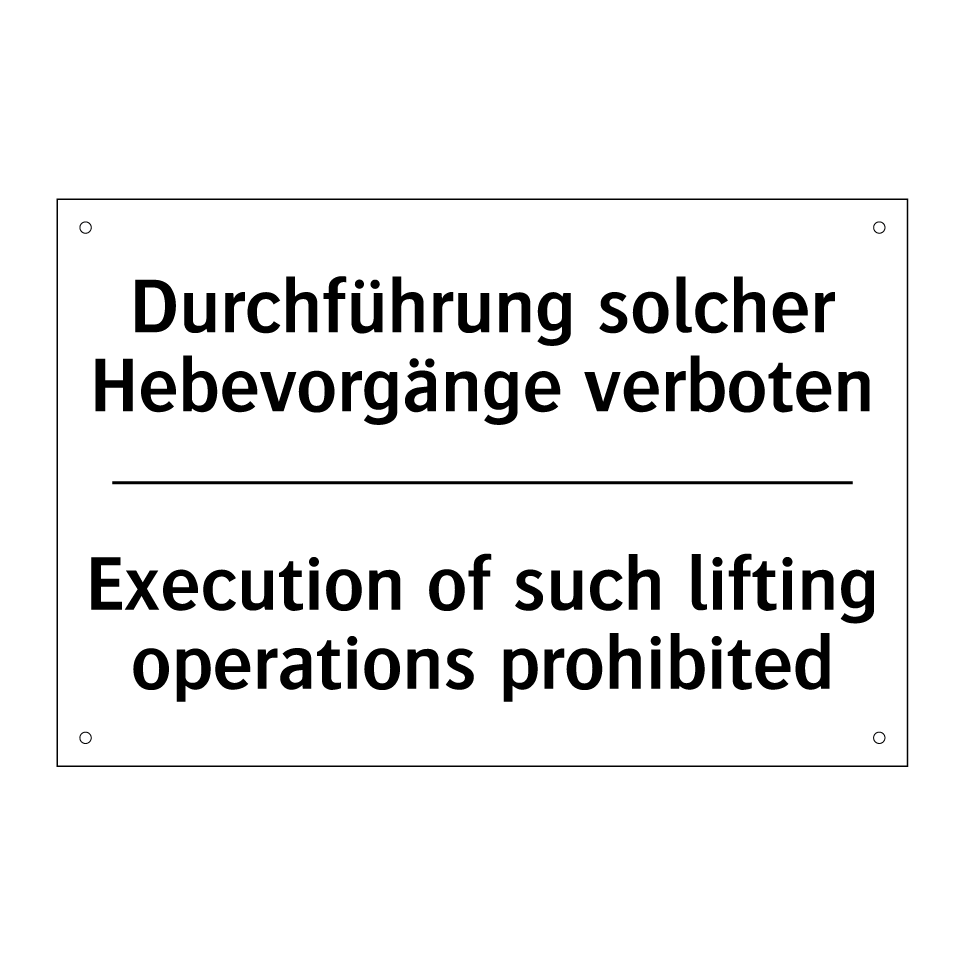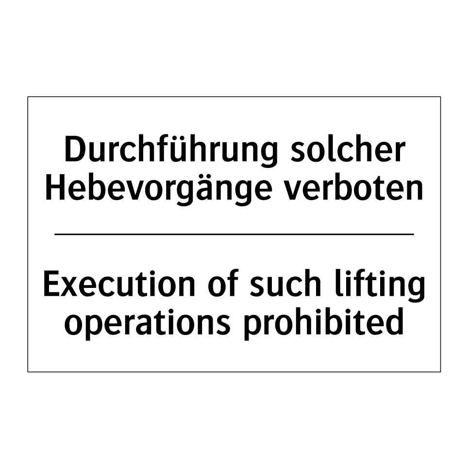 Zweisprachiges Verbotsschild mit deutschem Text Durchführung solcher Hebevorgänge verboten und englischem Text Execution of such lifting operations prohibited
