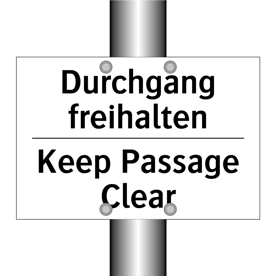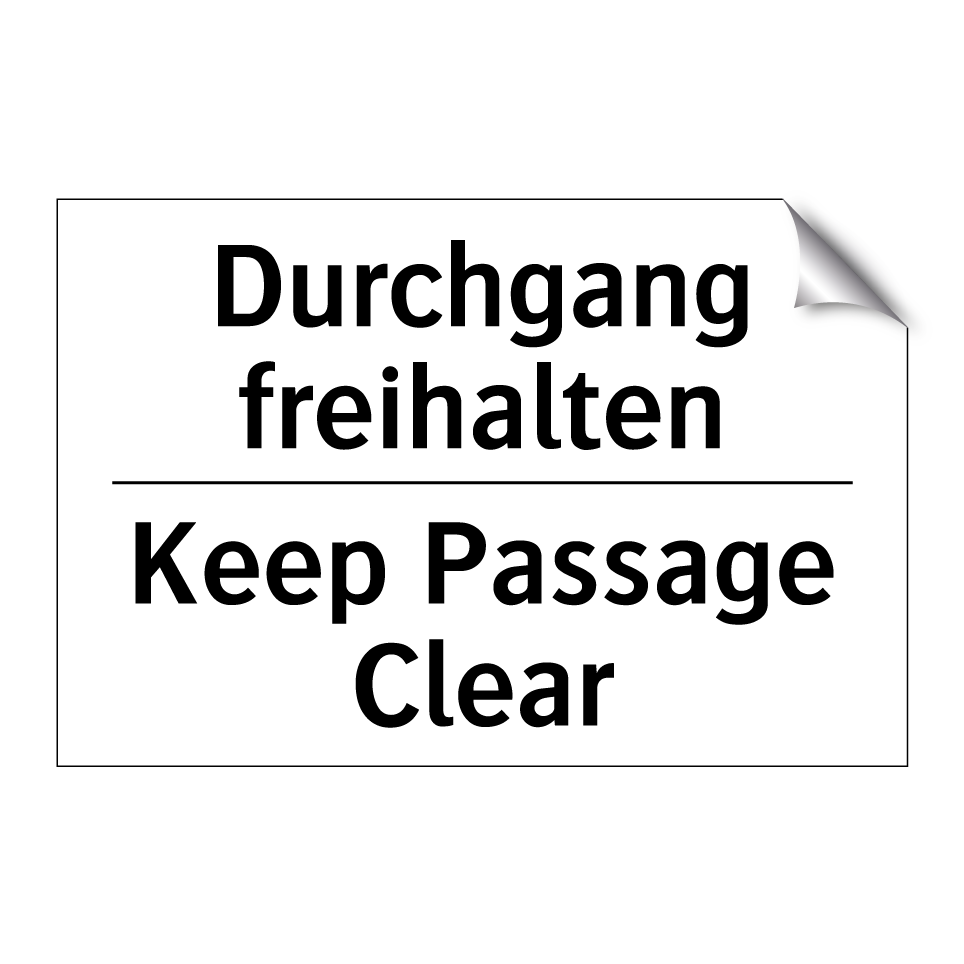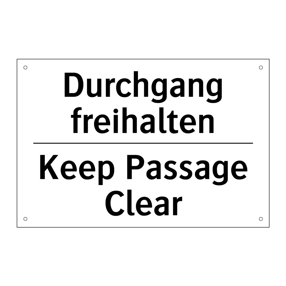 Zweisprachiges Verbotsschild mit deutschem Text Durchgang freihalten und englischem Text Keep Passage Clear