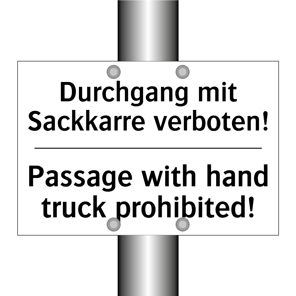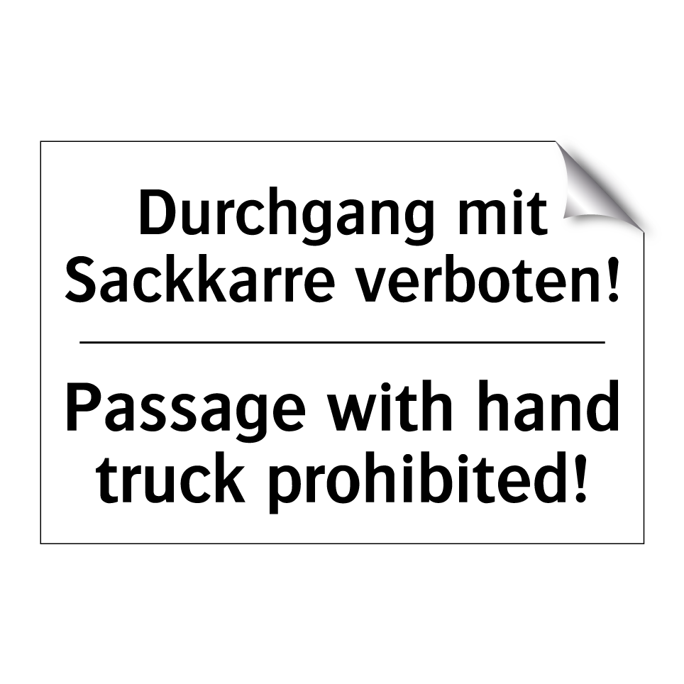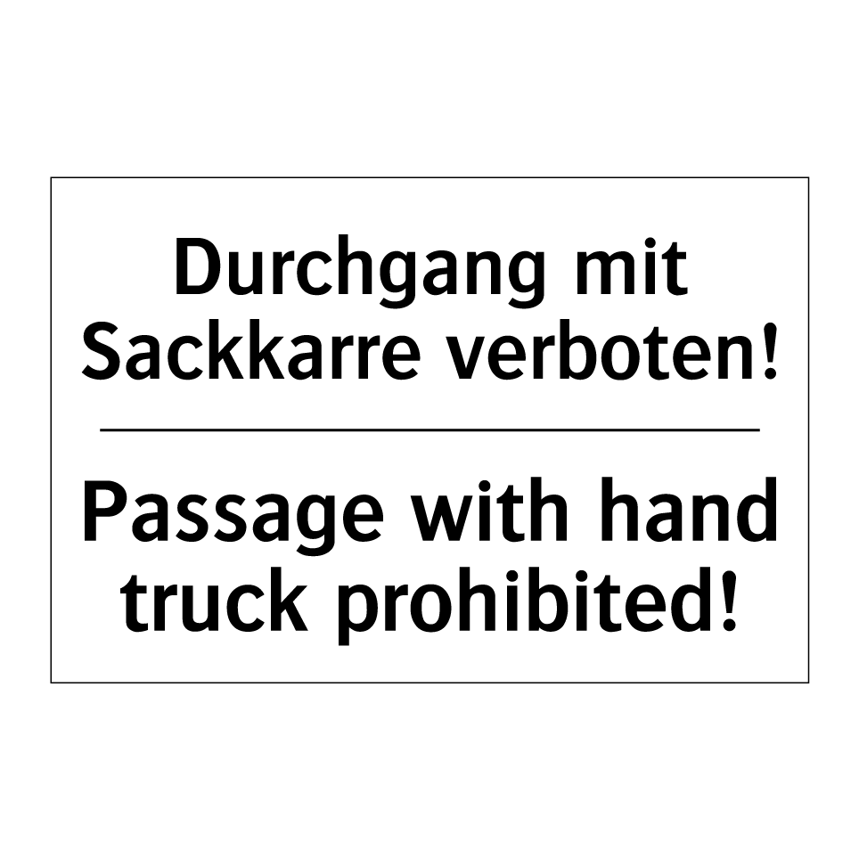 Zweisprachiges Verbotsschild mit deutschem Text Durchgang mit Sackkarre verboten! und englischem Text Passage with hand truck prohibited!