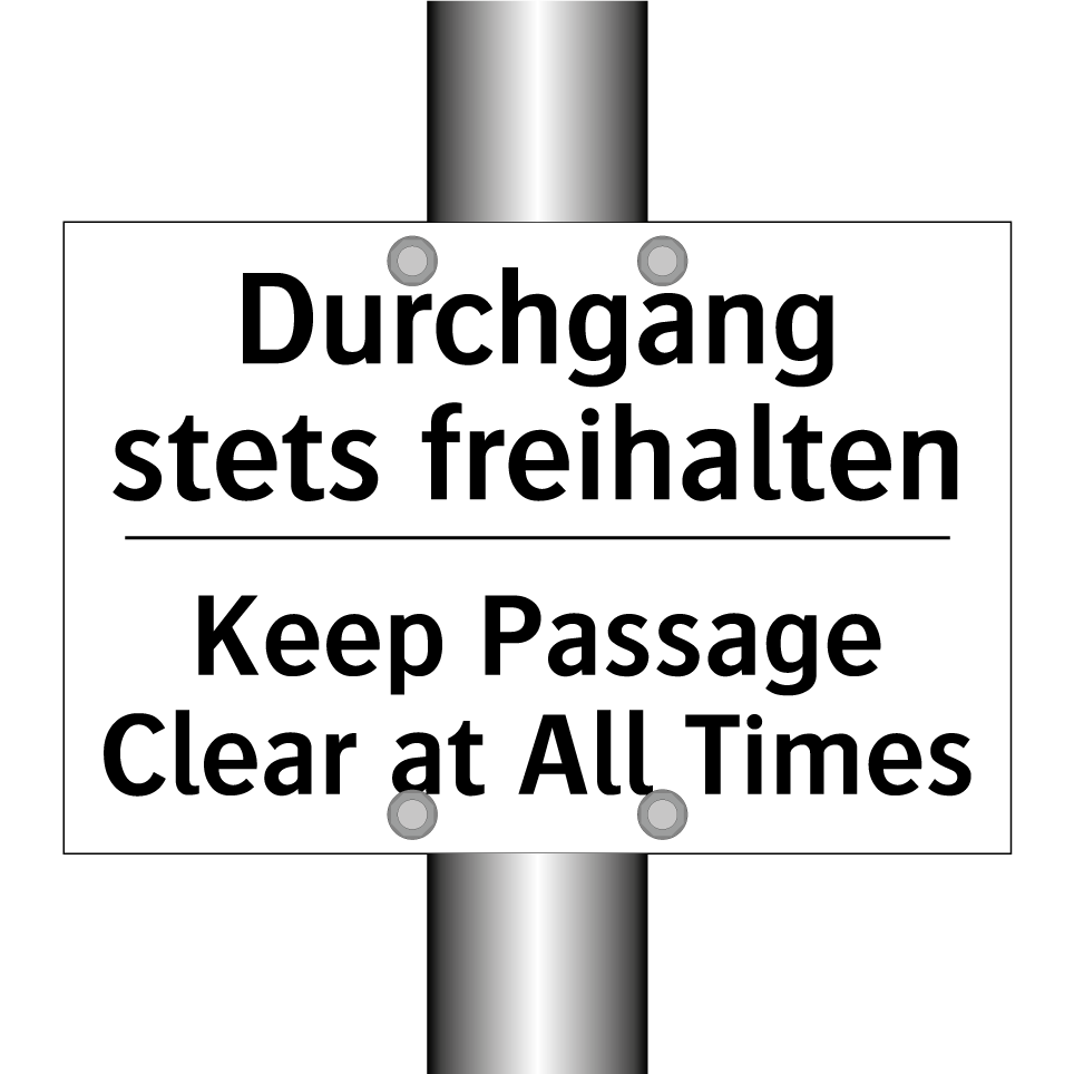 Zweisprachiges Verbotsschild mit deutschem Text Durchgang stets freihalten und englischem Text Keep Passage Clear at All Times