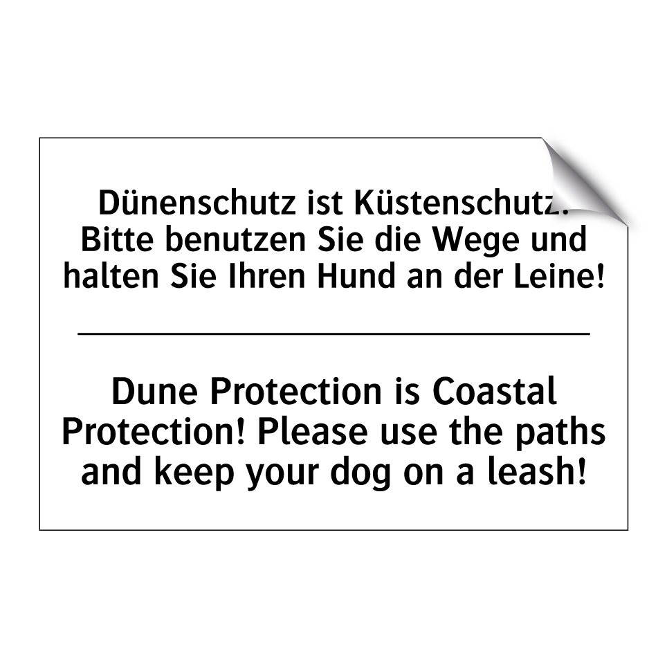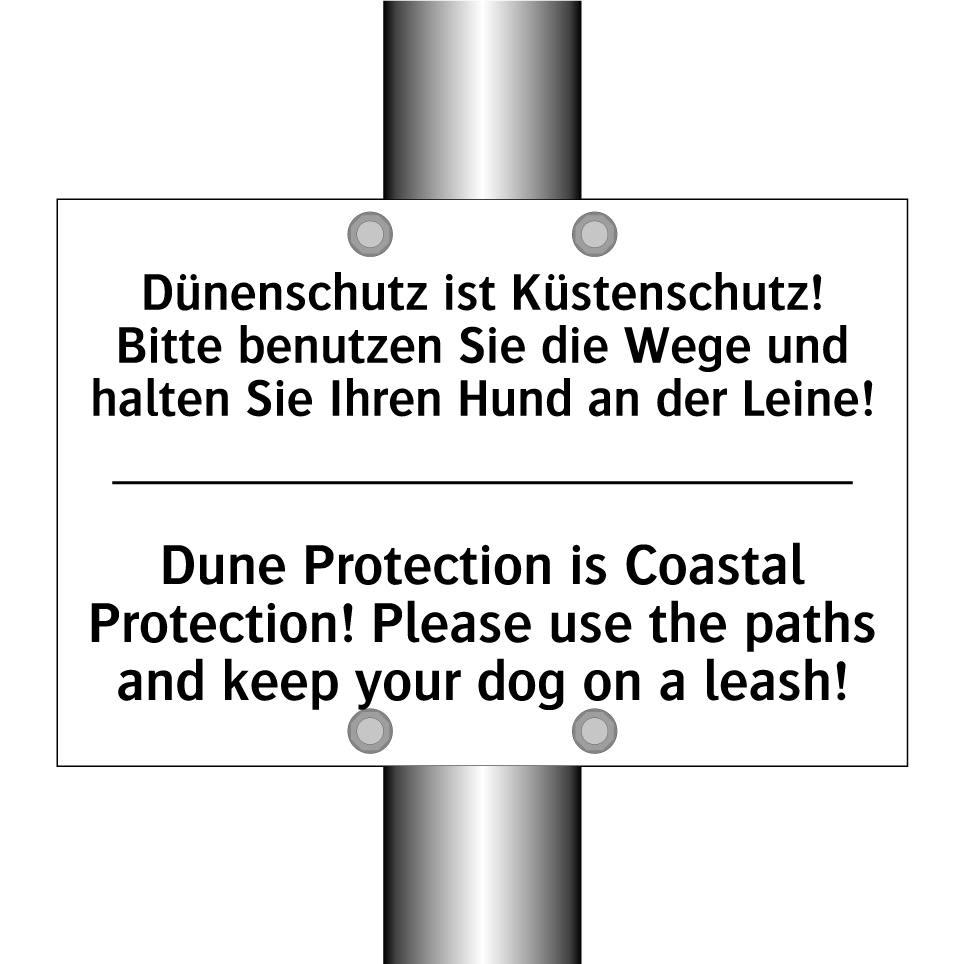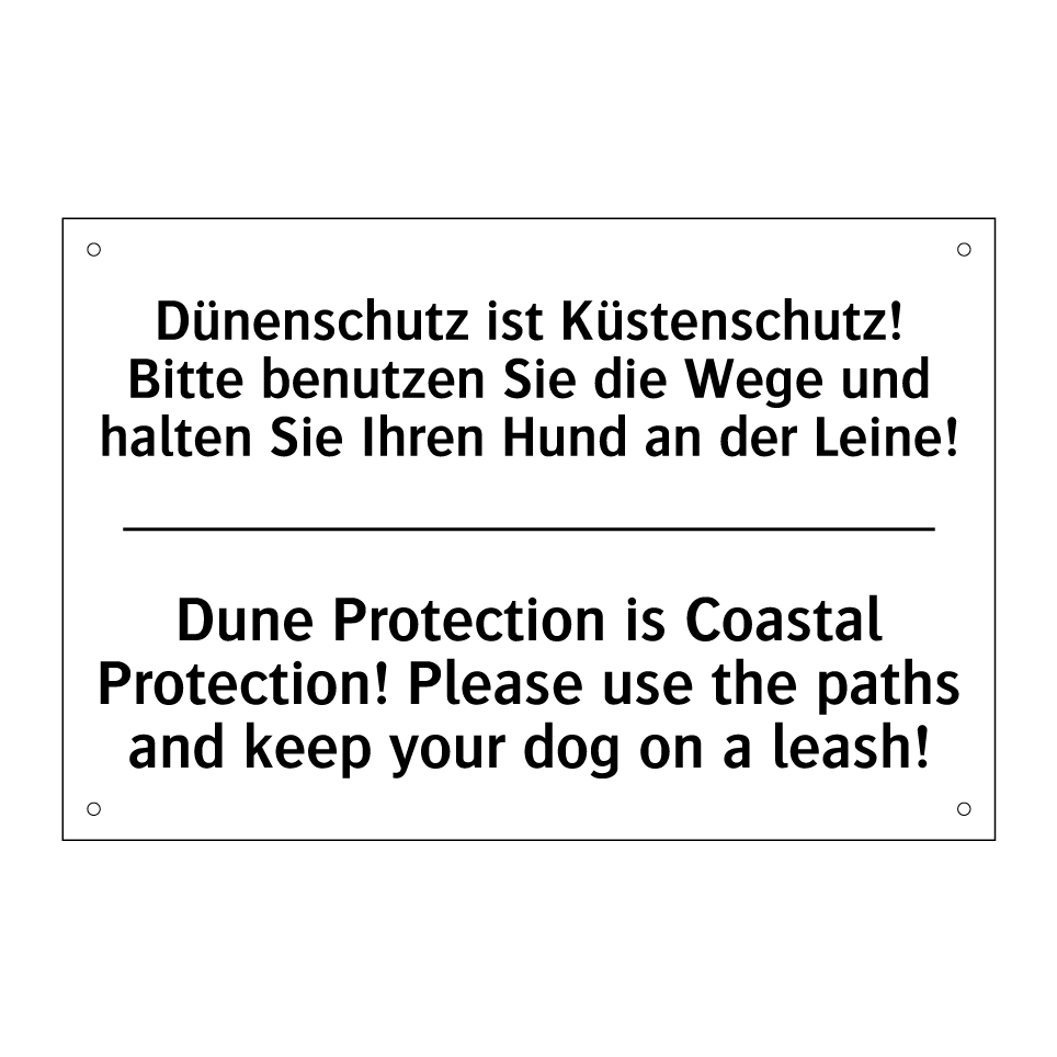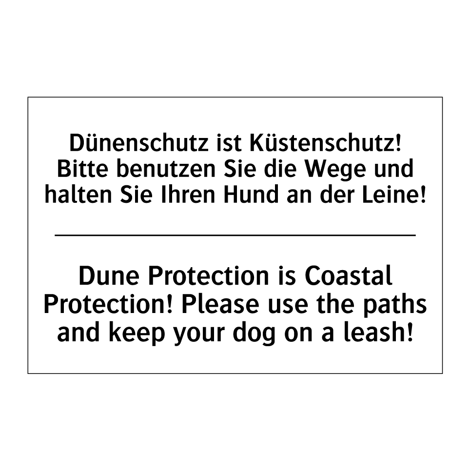 Zweisprachiges Verbotsschild mit deutschem Text Dünenschutz ist Küstenschutz! Bitte benutzen Sie die Wege und halten Sie Ihren Hund an der Leine! und englischem Text Dune Protection is Coastal Protection! Please use the paths and keep your dog on a leash!