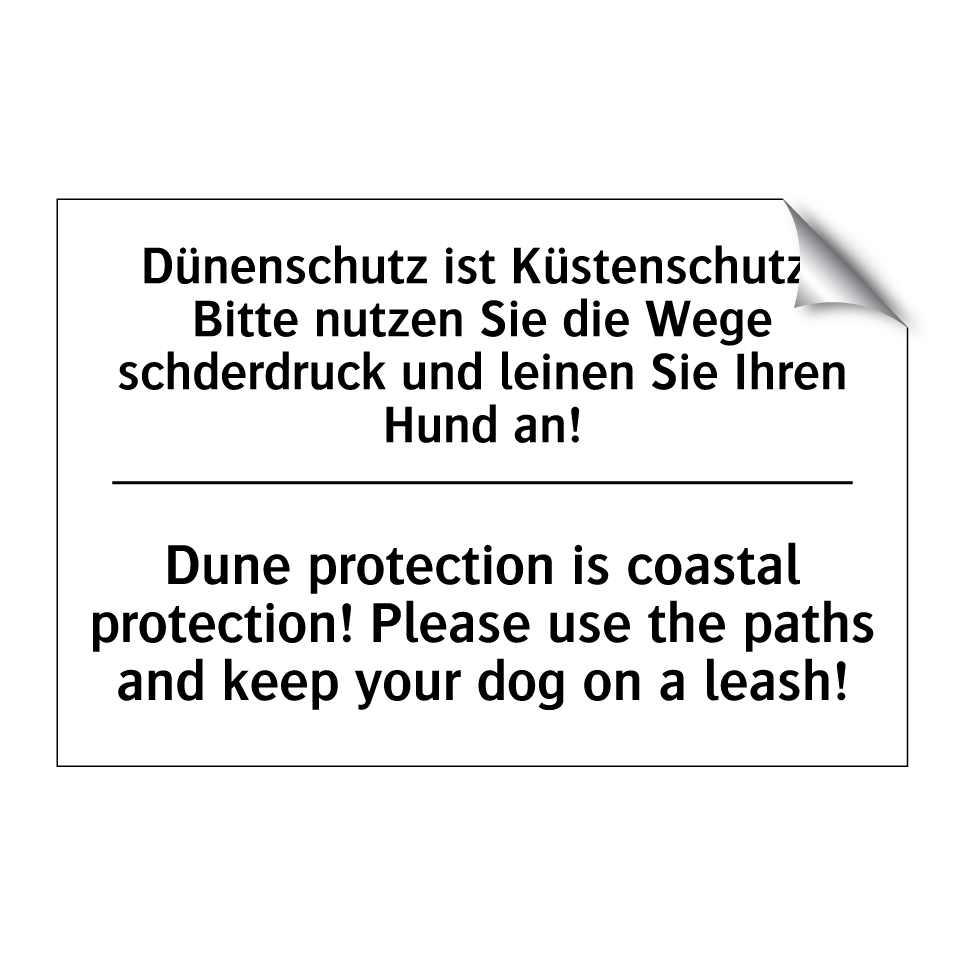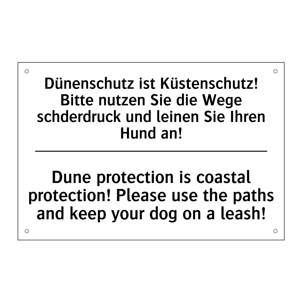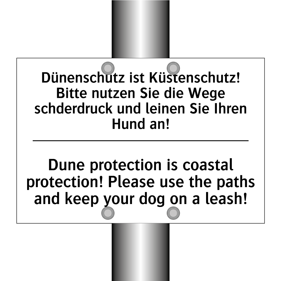 Zweisprachiges Verbotsschild mit deutschem Text Dünenschutz ist Küstenschutz! Bitte nutzen Sie die Wege schderdruck und leinen Sie Ihren Hund an! und englischem Text Dune protection is coastal protection! Please use the paths and keep your dog on a leash!