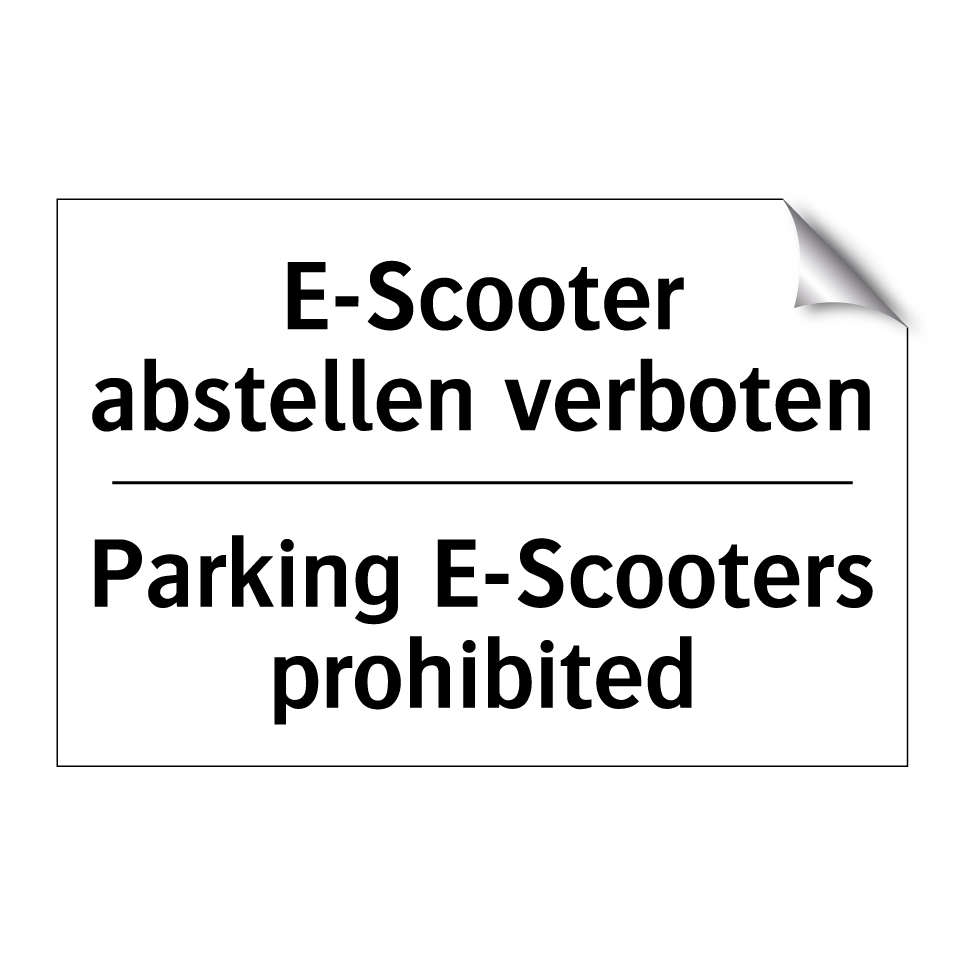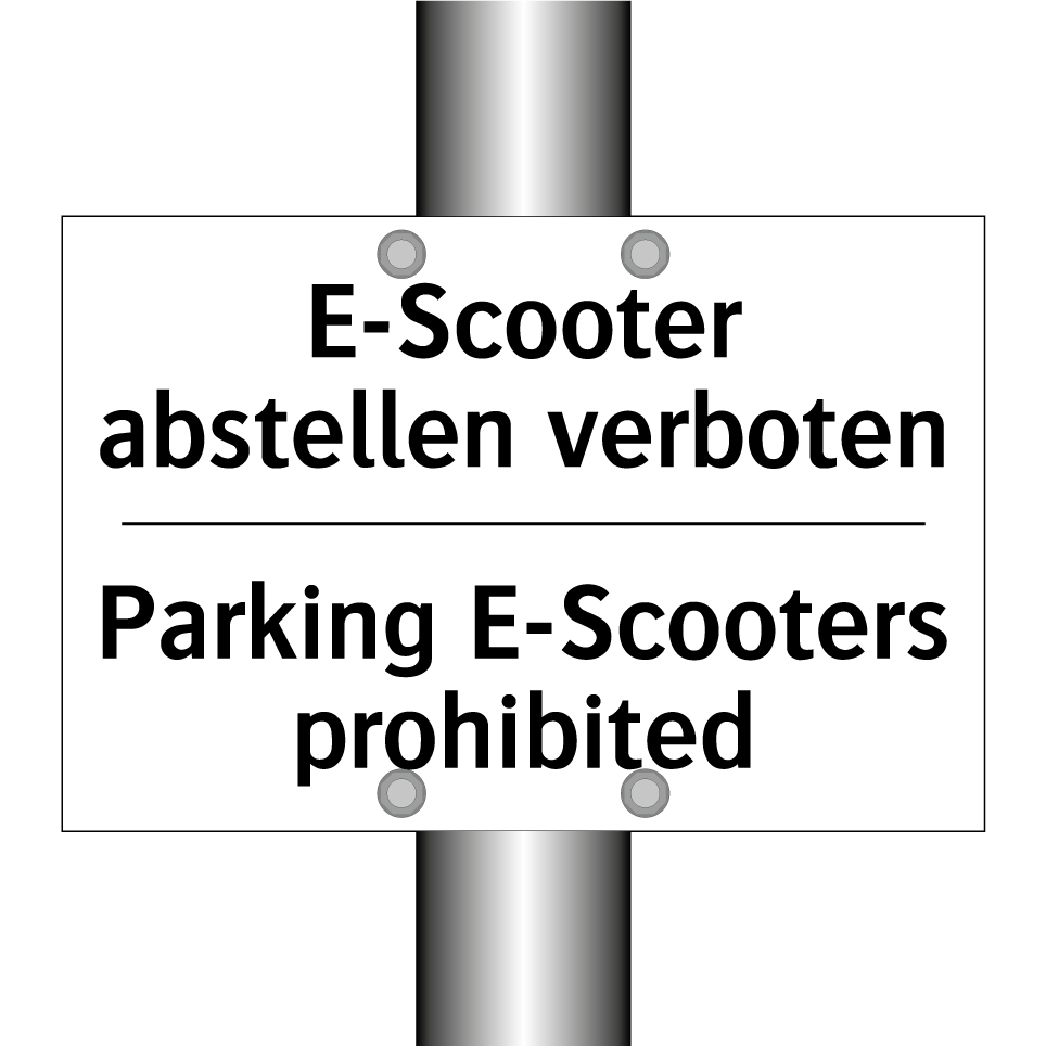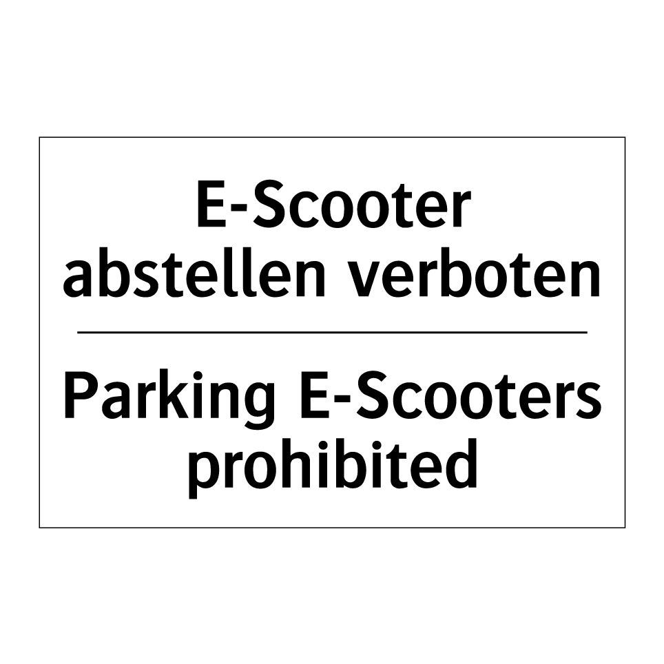 Zweisprachiges Verbotsschild mit deutschem Text E-Scooter abstellen verboten und englischem Text Parking E-Scooters prohibited