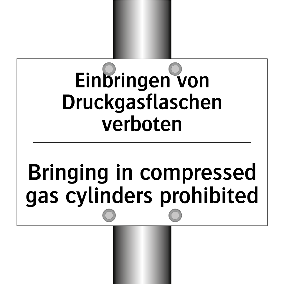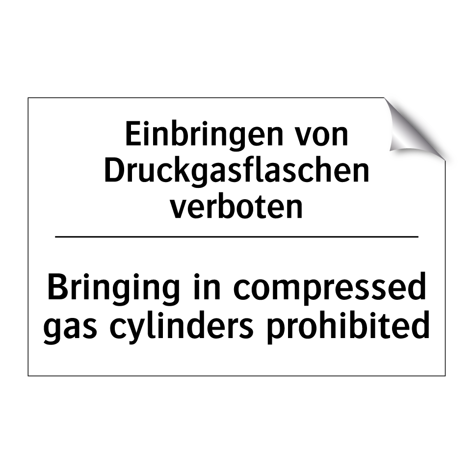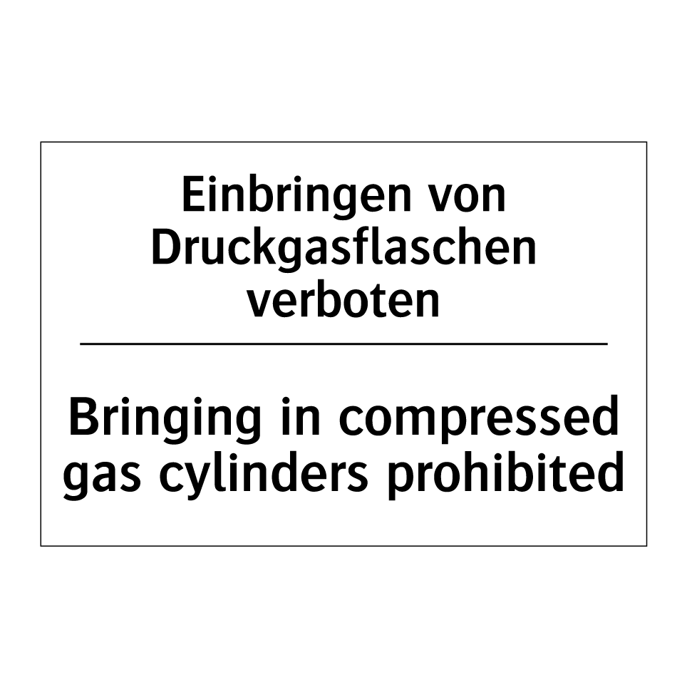 Zweisprachiges Verbotsschild mit deutschem Text Einbringen von Druckgasflaschen verboten und englischem Text Bringing in compressed gas cylinders prohibited