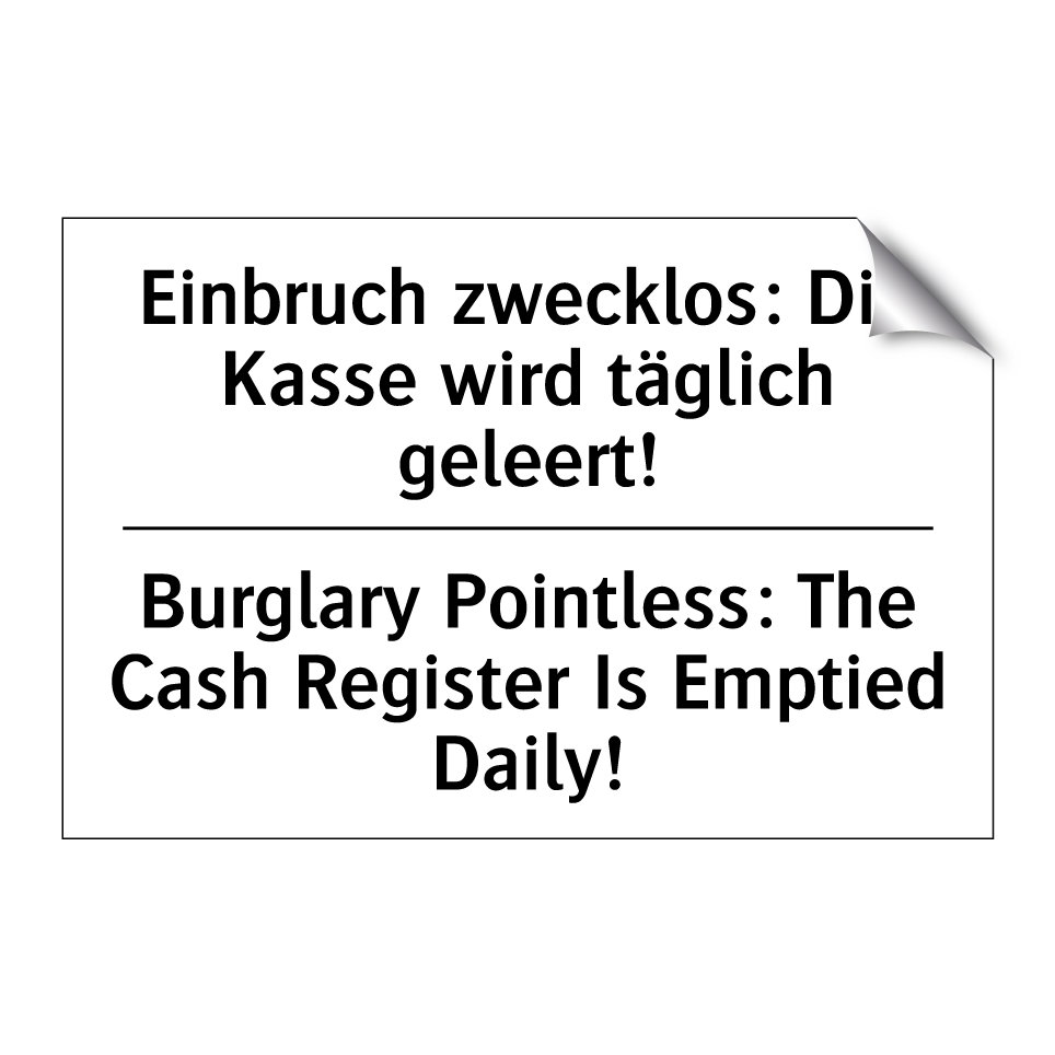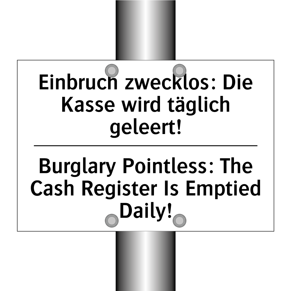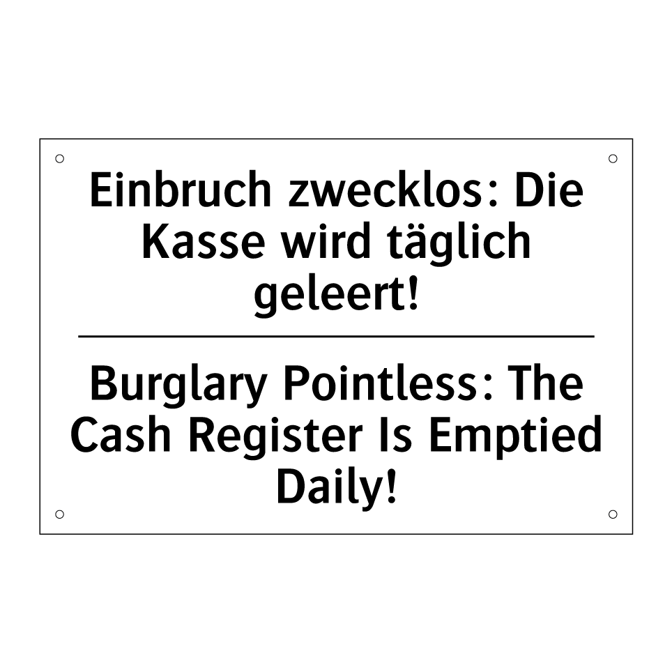 Zweisprachiges Verbotsschild mit deutschem Text Einbruch zwecklos: Die Kasse wird täglich geleert! und englischem Text Burglary Pointless: The Cash Register Is Emptied Daily!