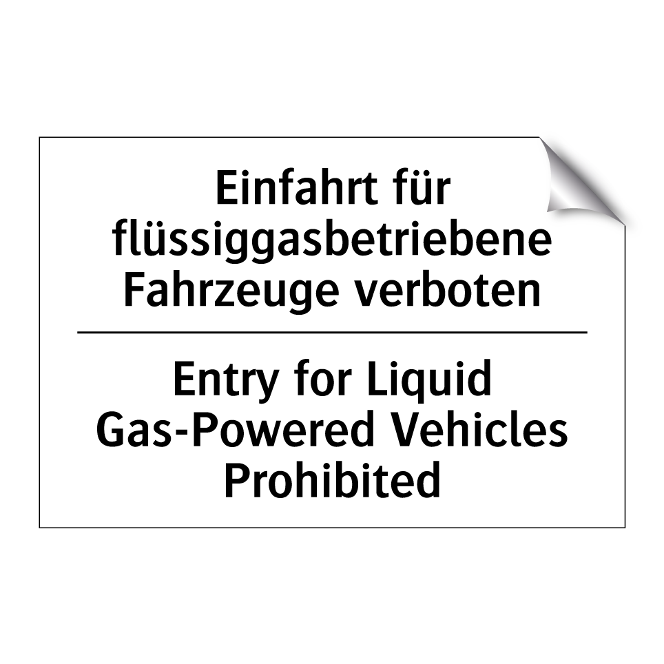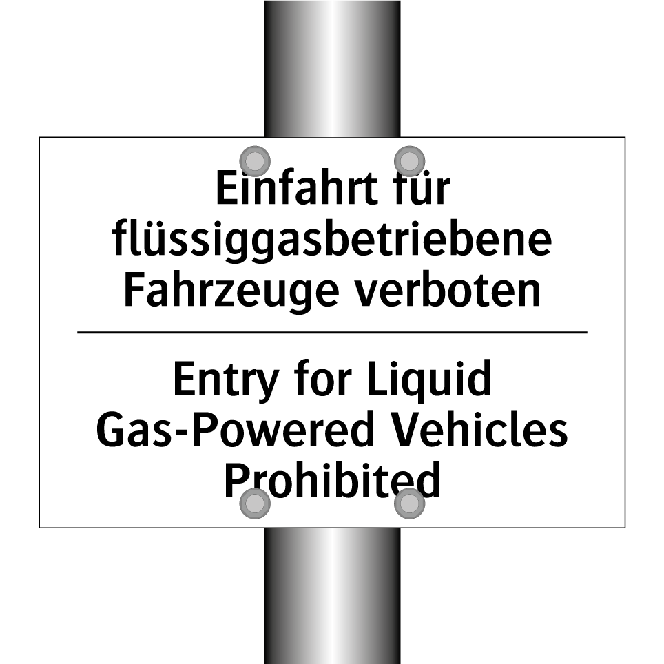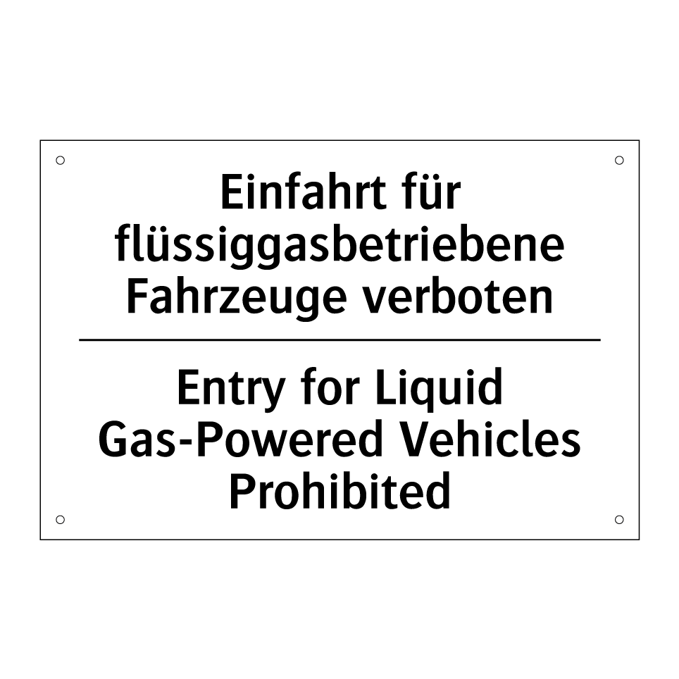 Zweisprachiges Verbotsschild mit deutschem Text Einfahrt für flüssiggasbetriebene Fahrzeuge verboten und englischem Text Entry for Liquid Gas-Powered Vehicles Prohibited