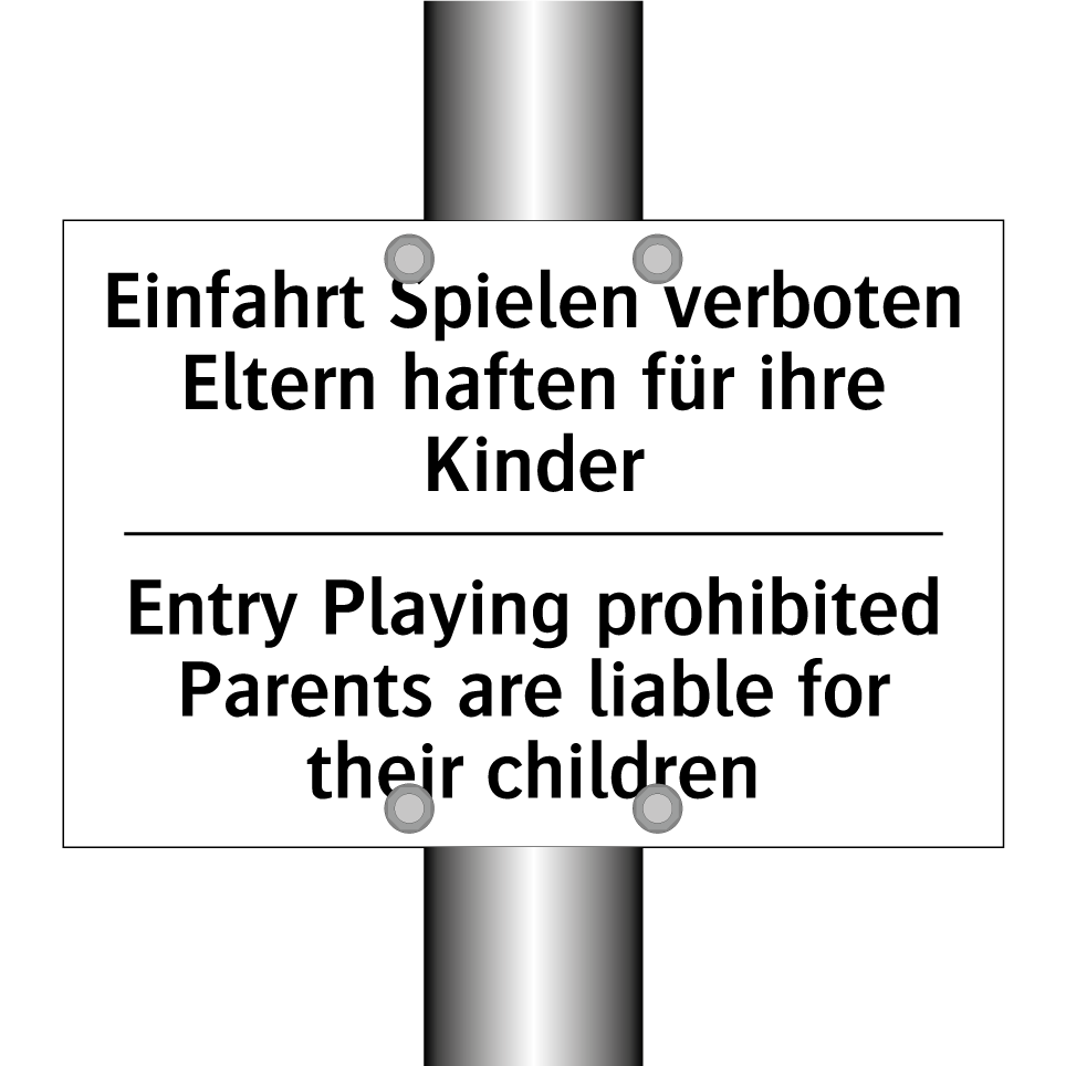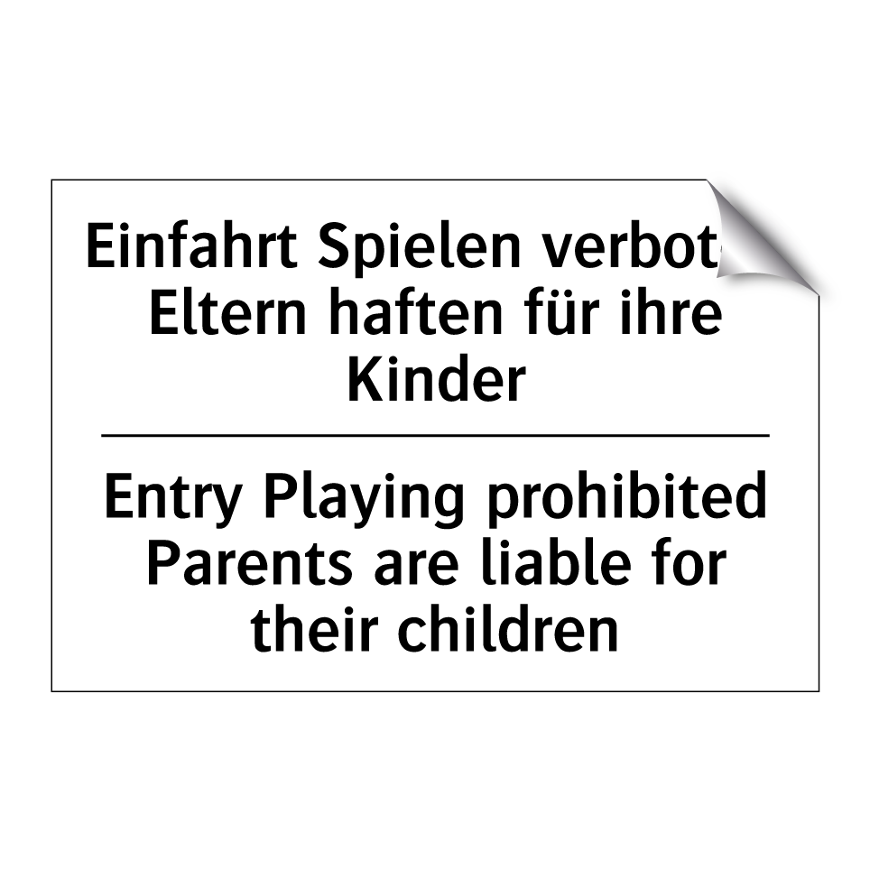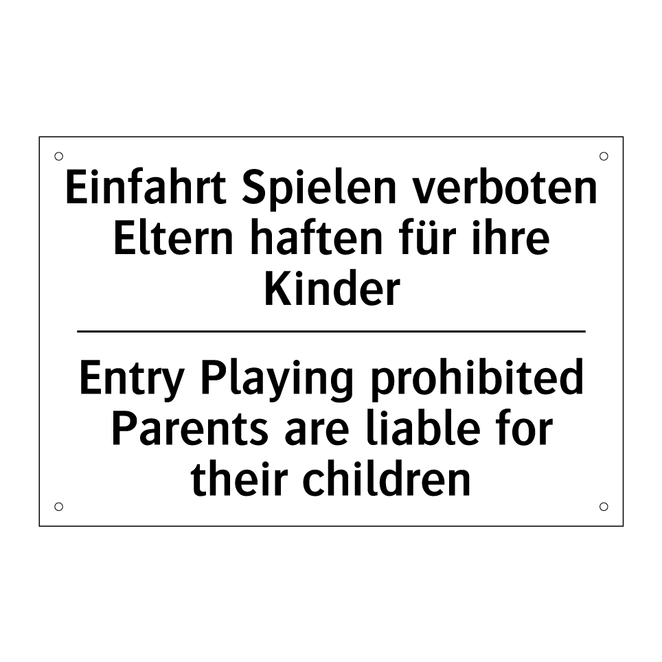 Zweisprachiges Verbotsschild mit deutschem Text Einfahrt Spielen verboten Eltern haften für ihre Kinder und englischem Text Entry Playing prohibited Parents are liable for their children