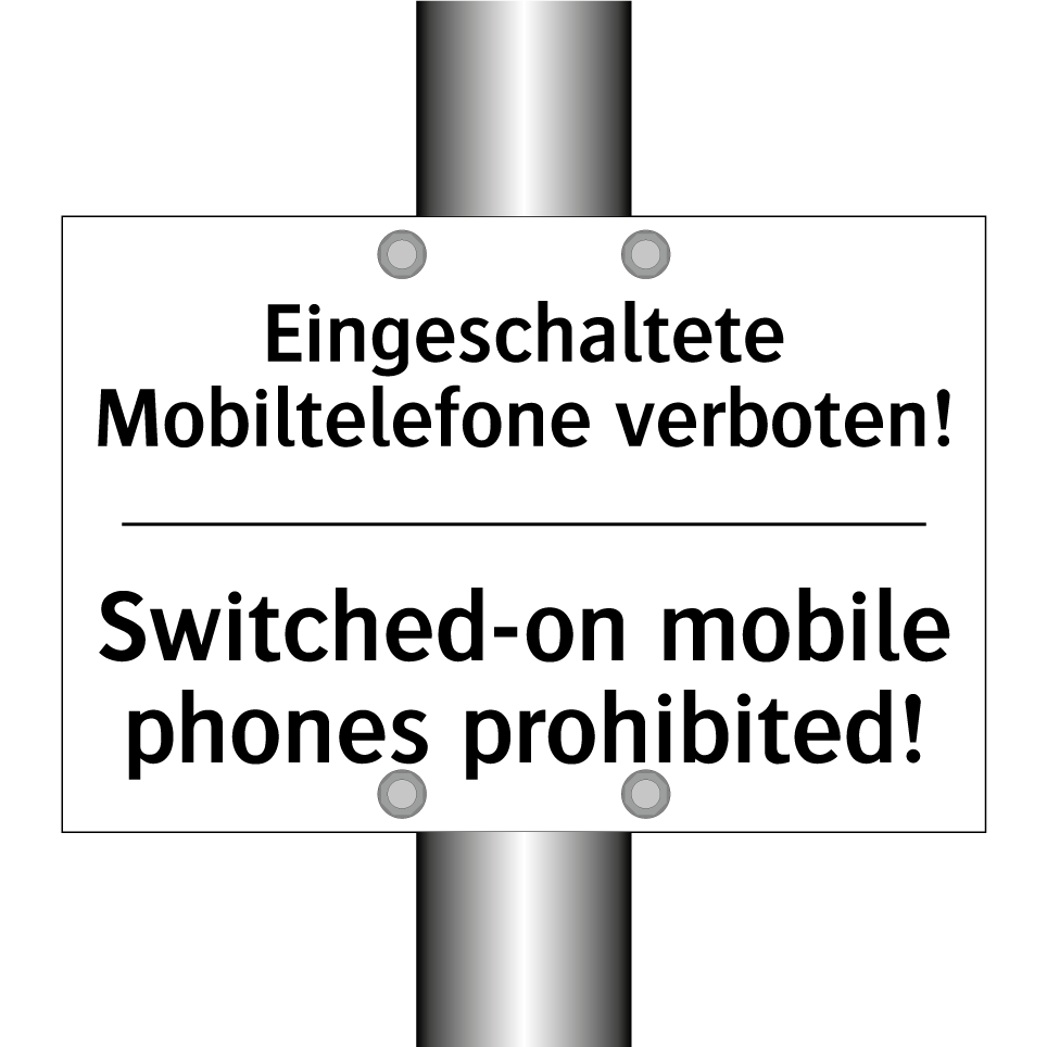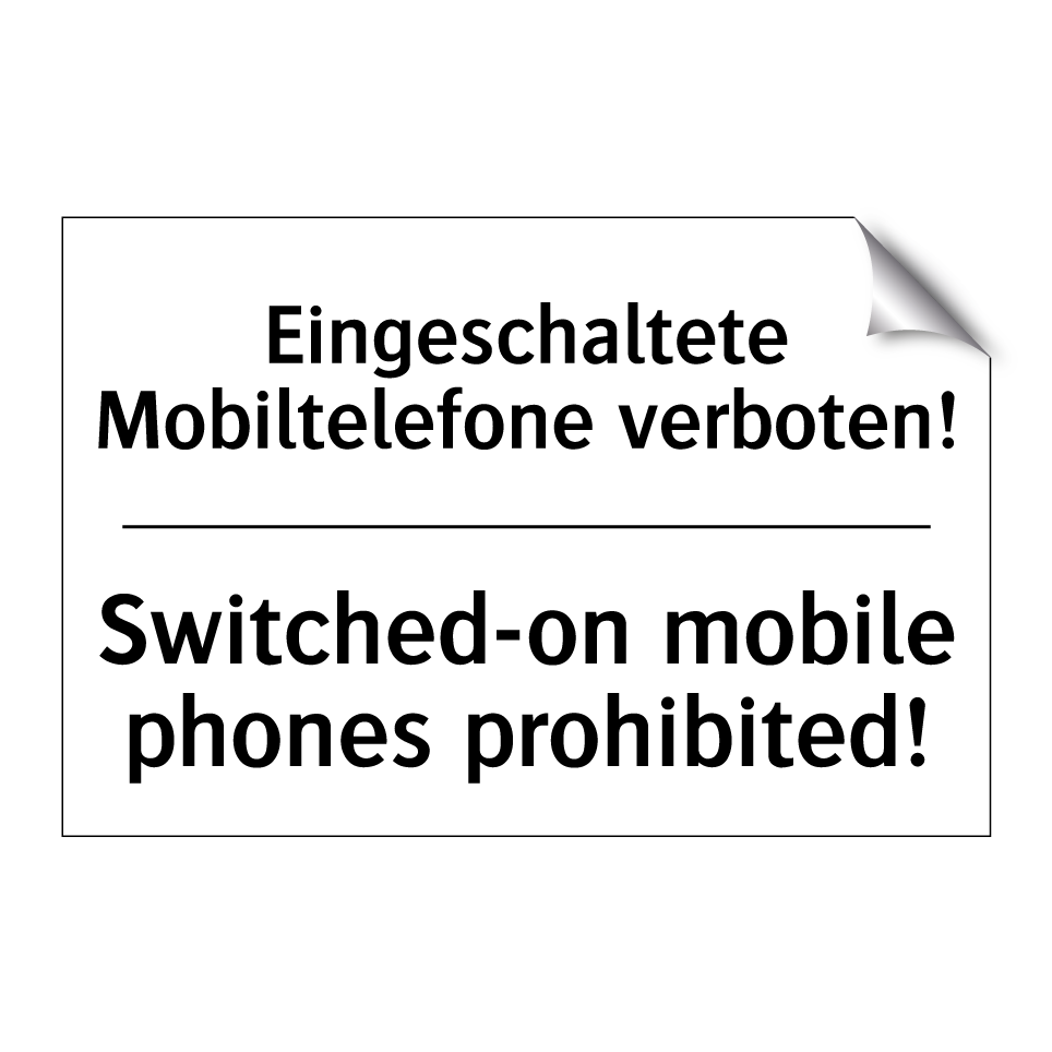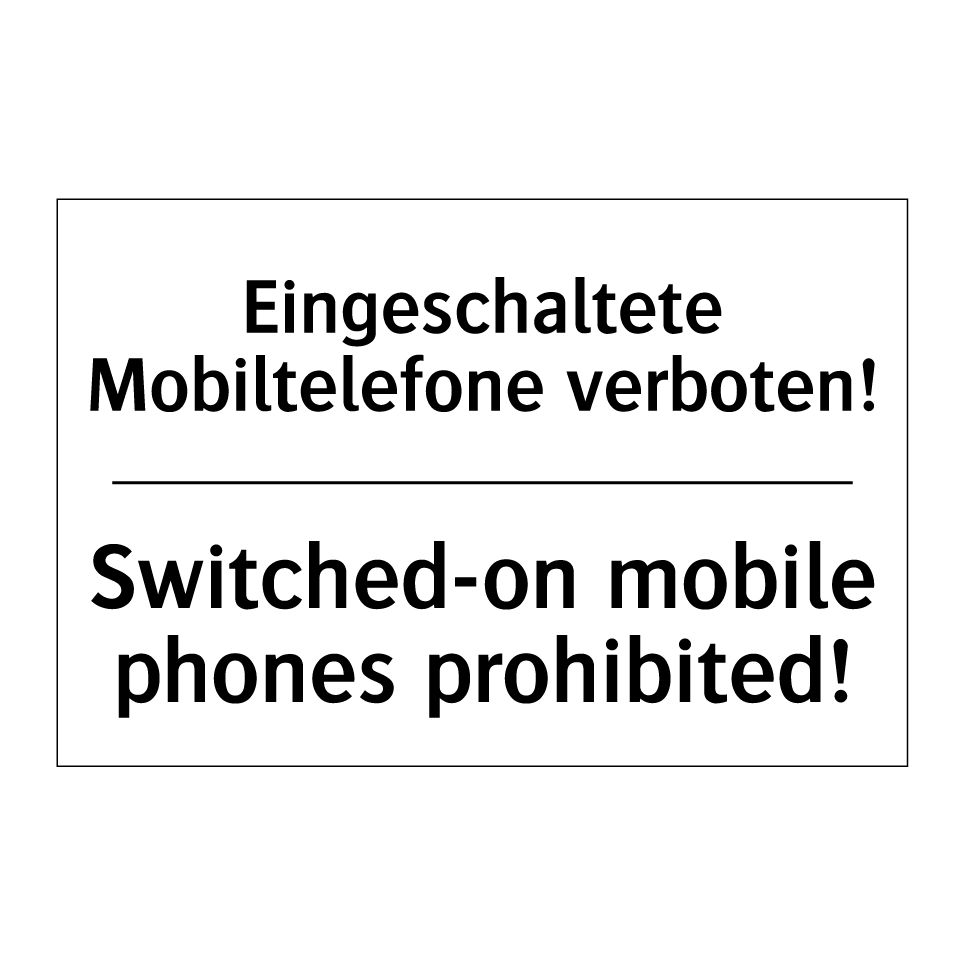Zweisprachiges Verbotsschild mit deutschem Text Eingeschaltete Mobiltelefone verboten! und englischem Text Switched-on mobile phones prohibited!