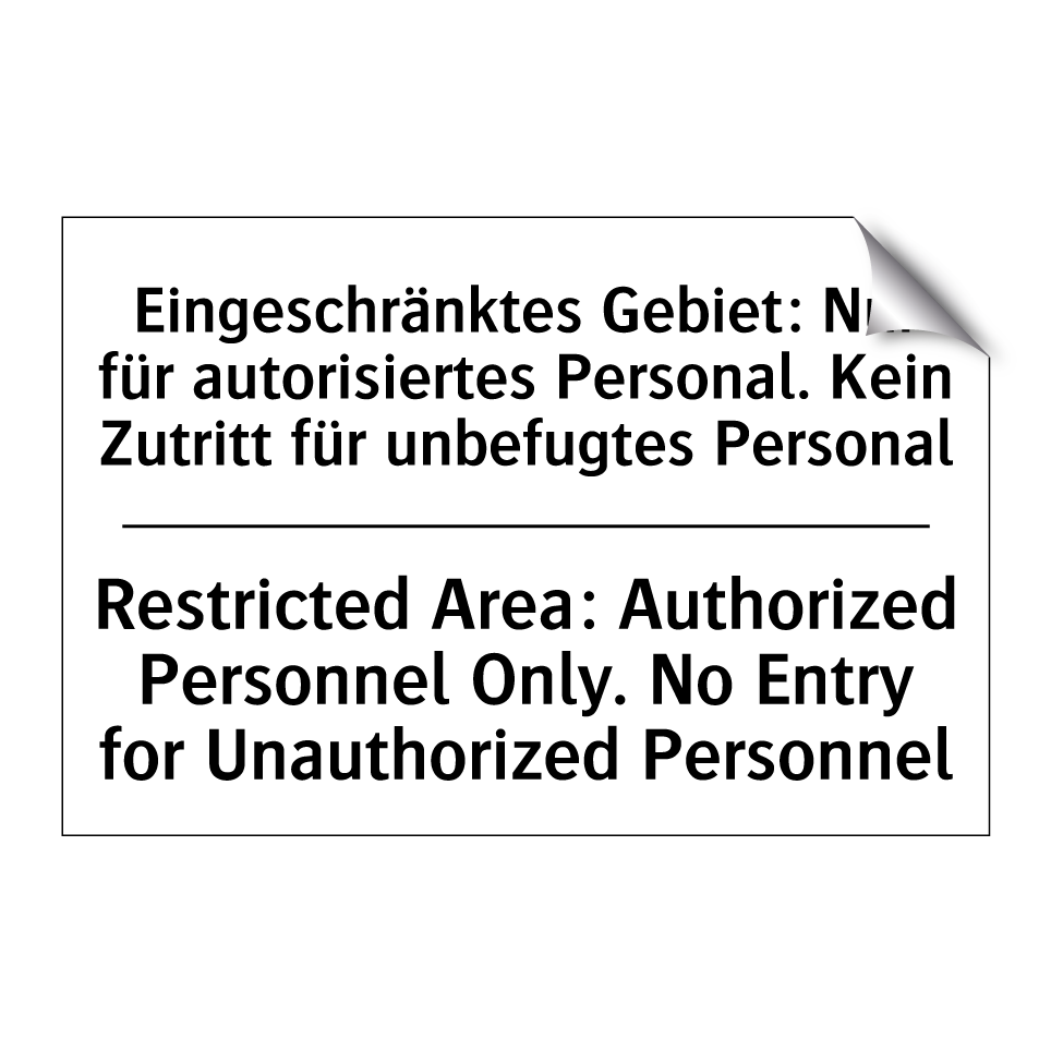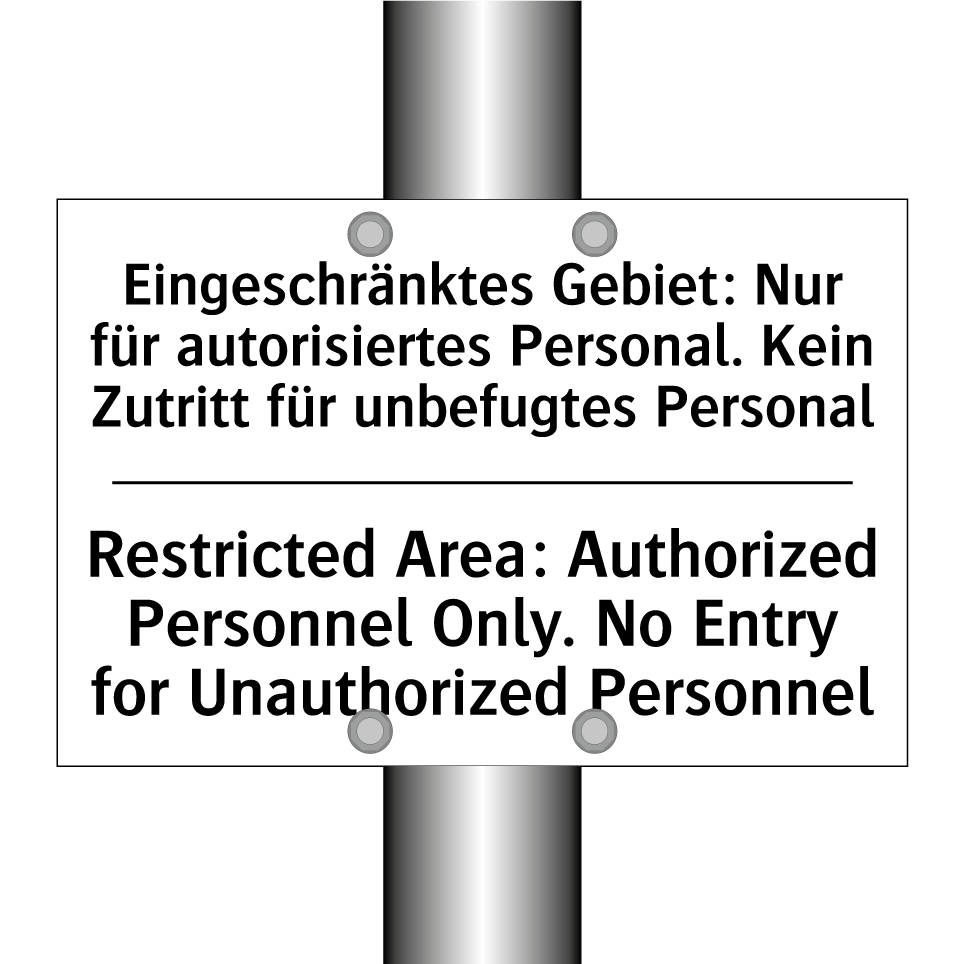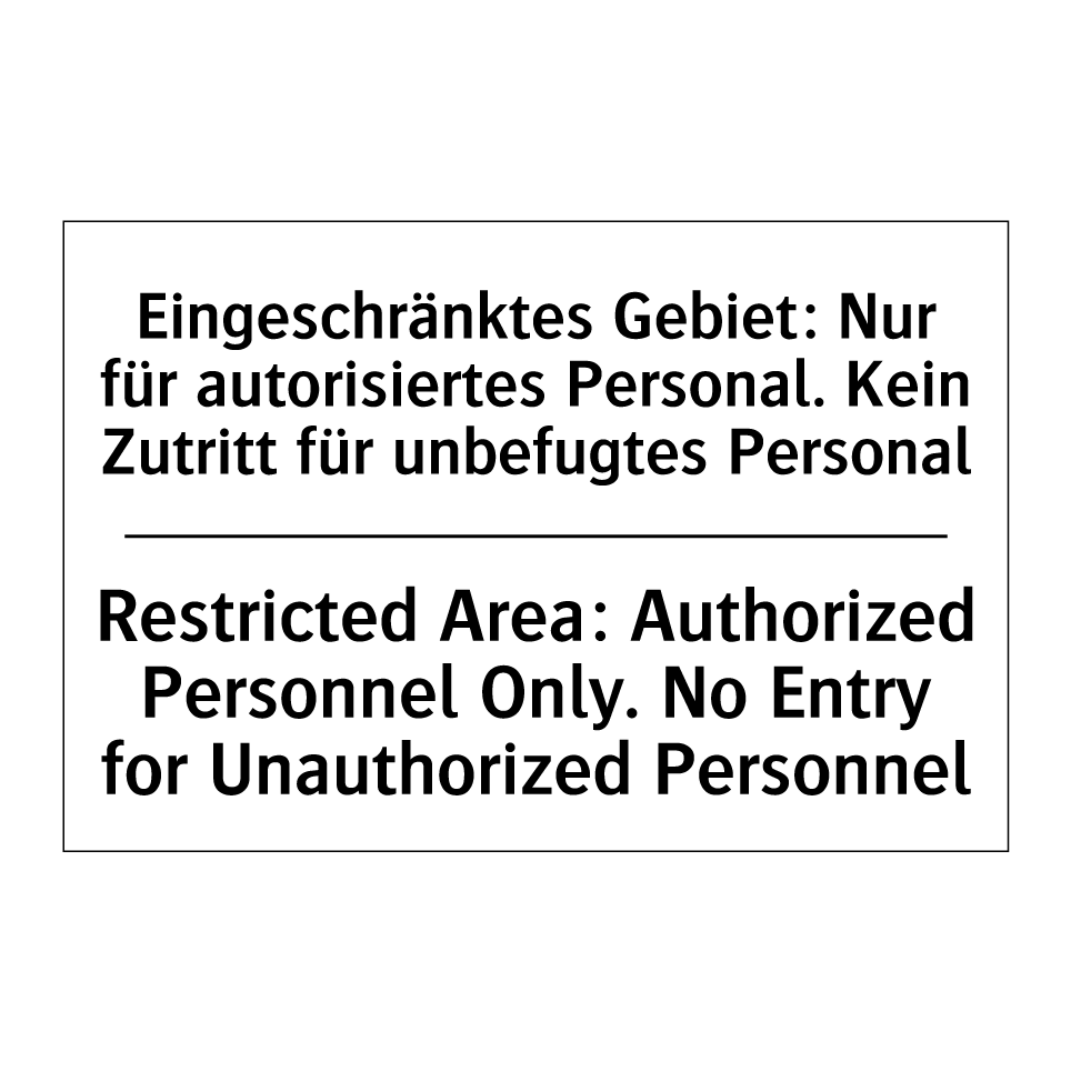 Zweisprachiges Verbotsschild mit deutschem Text Eingeschränktes Gebiet: Nur für autorisiertes Personal. Kein Zutritt für unbefugtes Personal und englischem Text Restricted Area: Authorized Personnel Only. No Entry for Unauthorized Personnel