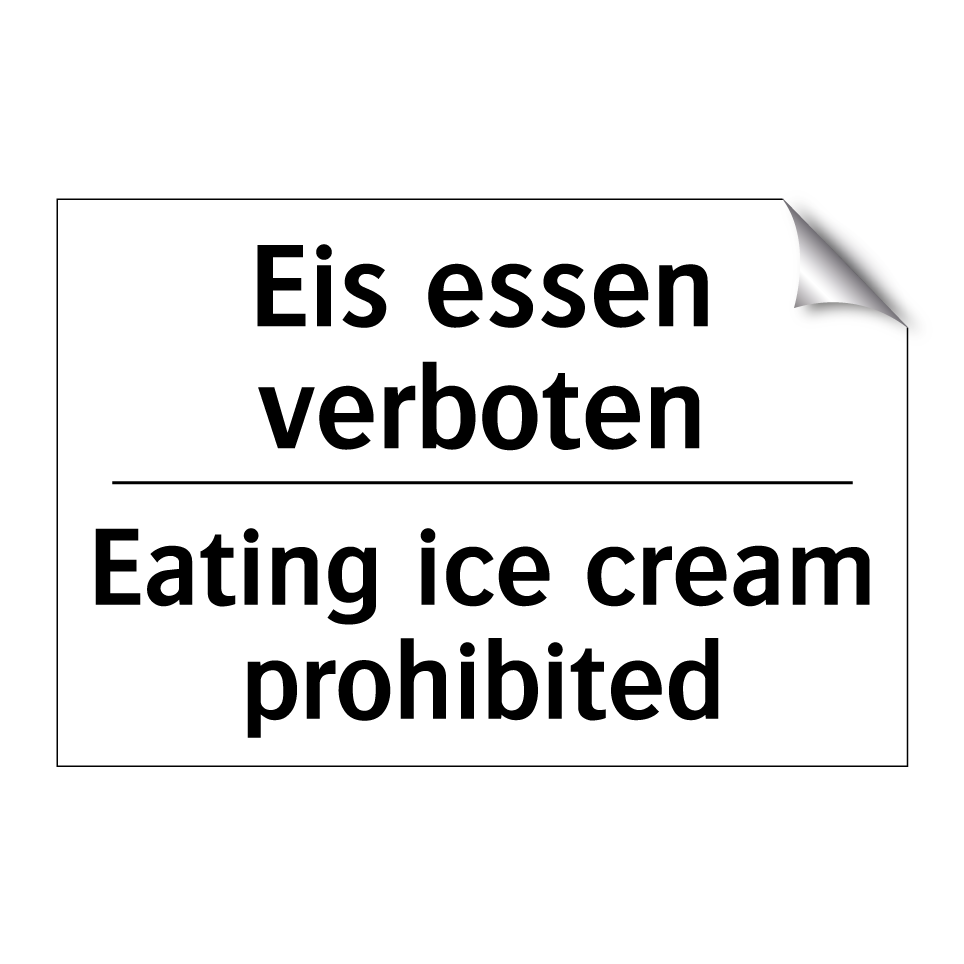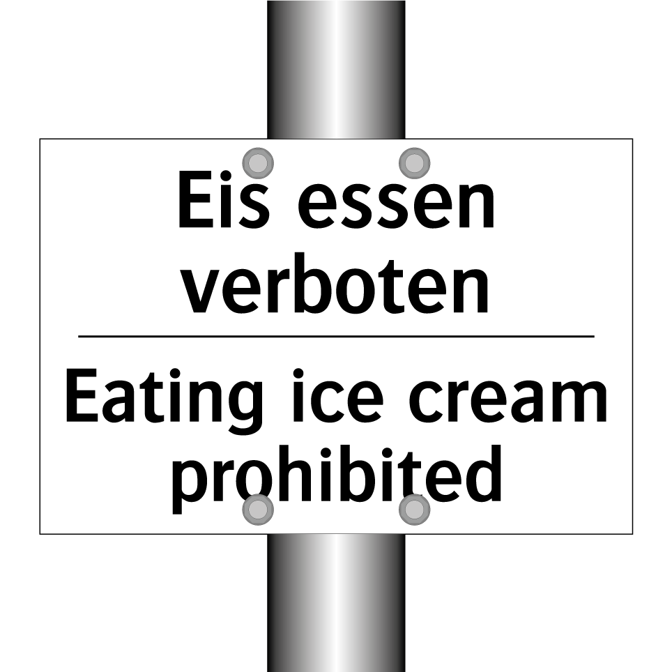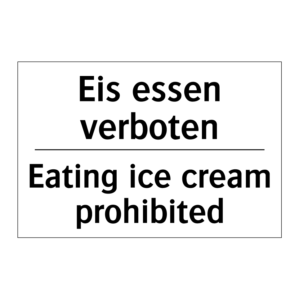 Zweisprachiges Verbotsschild mit deutschem Text Eis essen verboten und englischem Text Eating ice cream prohibited