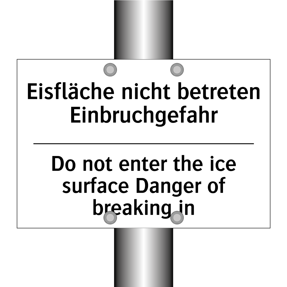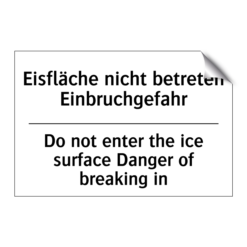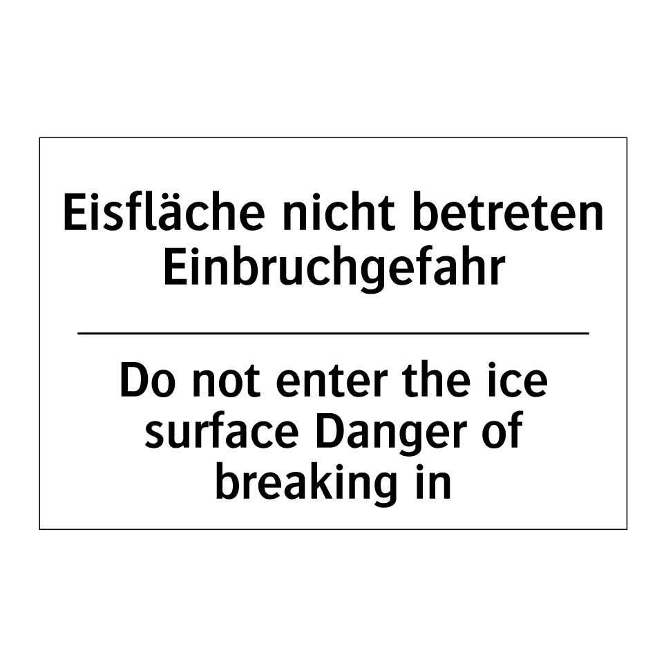 Zweisprachiges Verbotsschild mit deutschem Text Eisfläche nicht betreten Einbruchgefahr und englischem Text Do not enter the ice surface Danger of breaking in