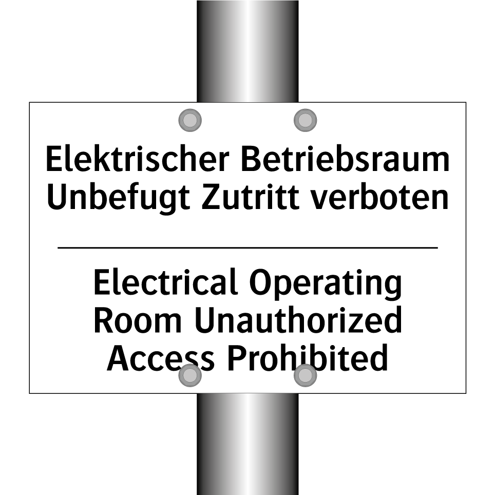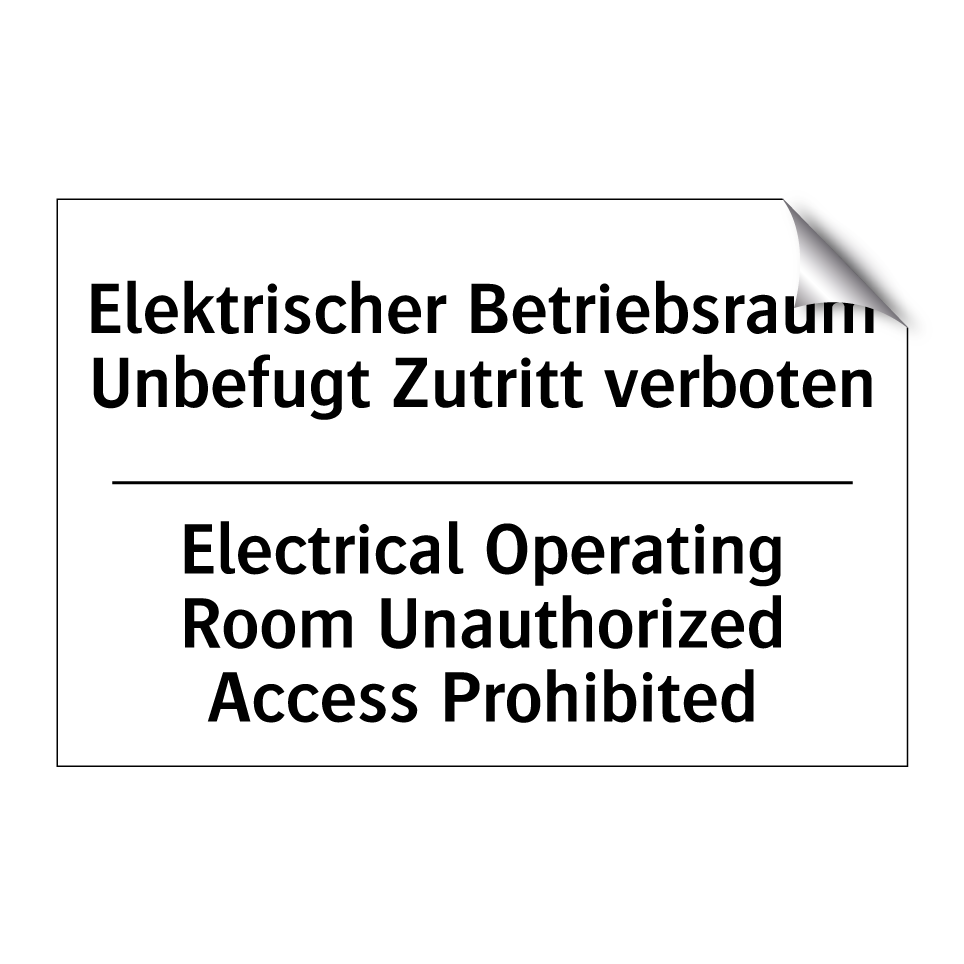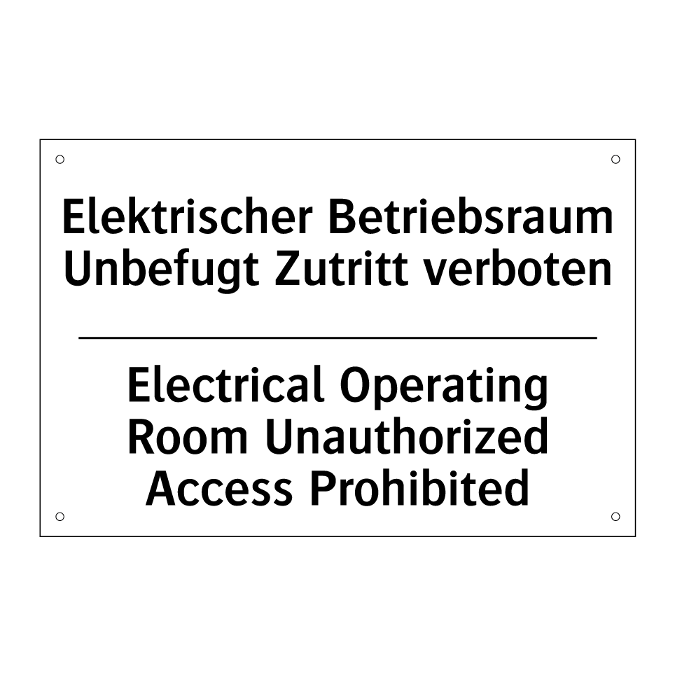 Zweisprachiges Verbotsschild mit deutschem Text Elektrischer Betriebsraum Unbefugt Zutritt verboten und englischem Text Electrical Operating Room Unauthorized Access Prohibited