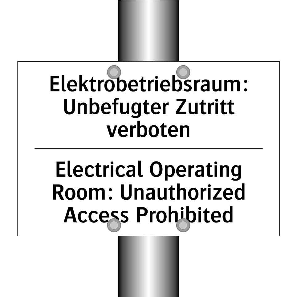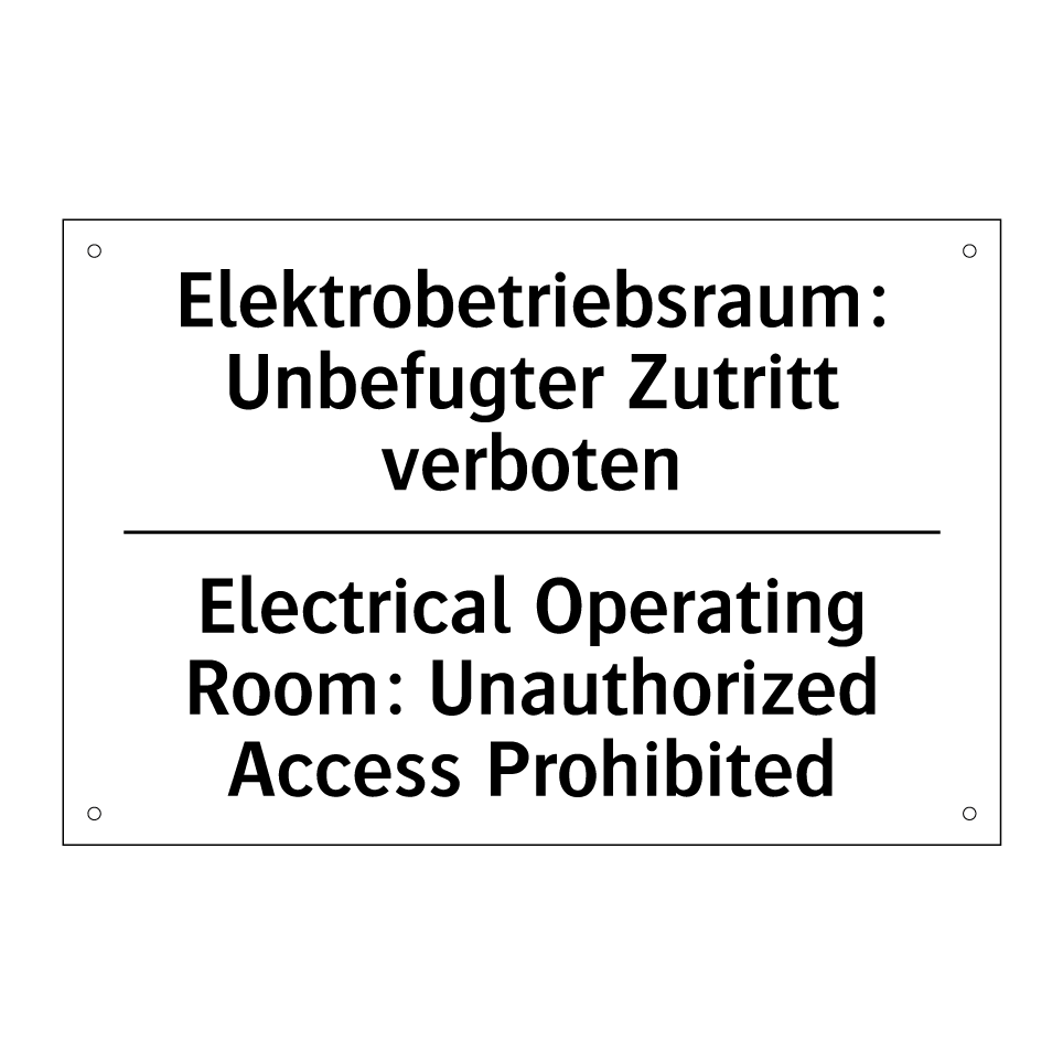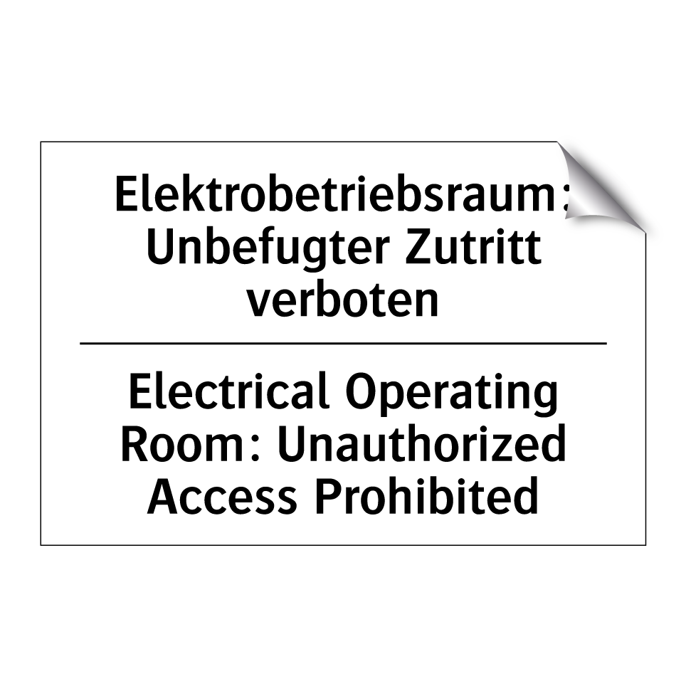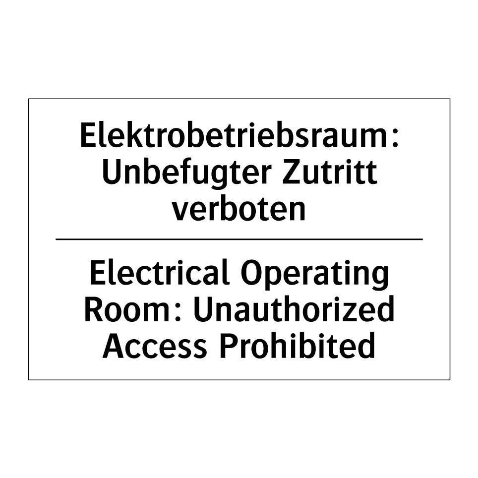 Zweisprachiges Verbotsschild mit deutschem Text Elektrobetriebsraum: Unbefugter Zutritt verboten und englischem Text Electrical Operating Room: Unauthorized Access Prohibited
