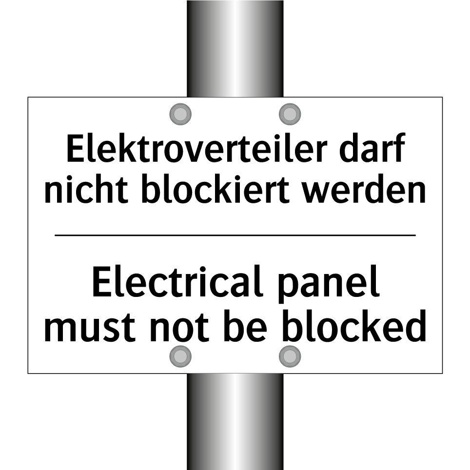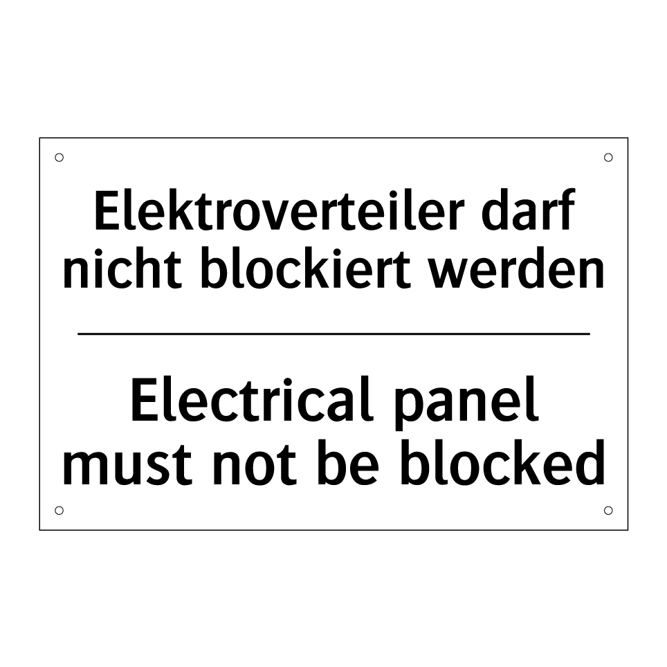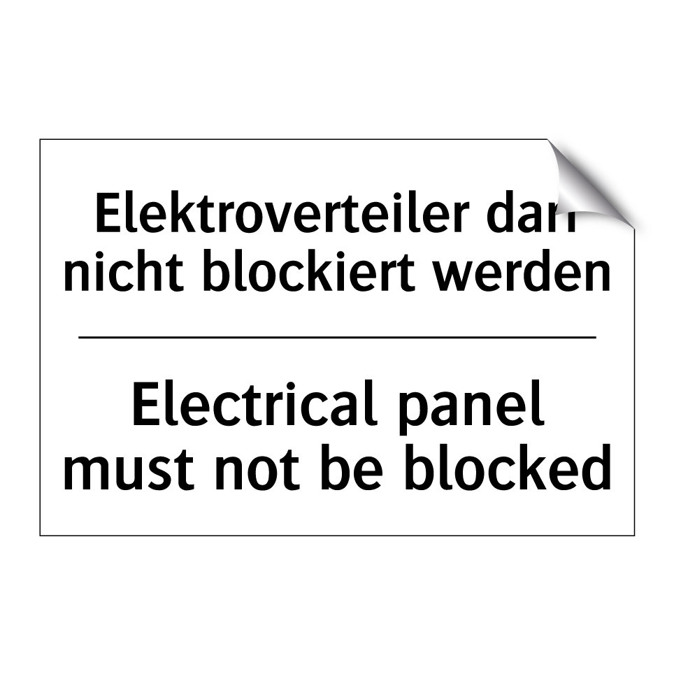Zweisprachiges Verbotsschild mit deutschem Text Elektroverteiler darf nicht blockiert werden und englischem Text Electrical panel must not be blocked