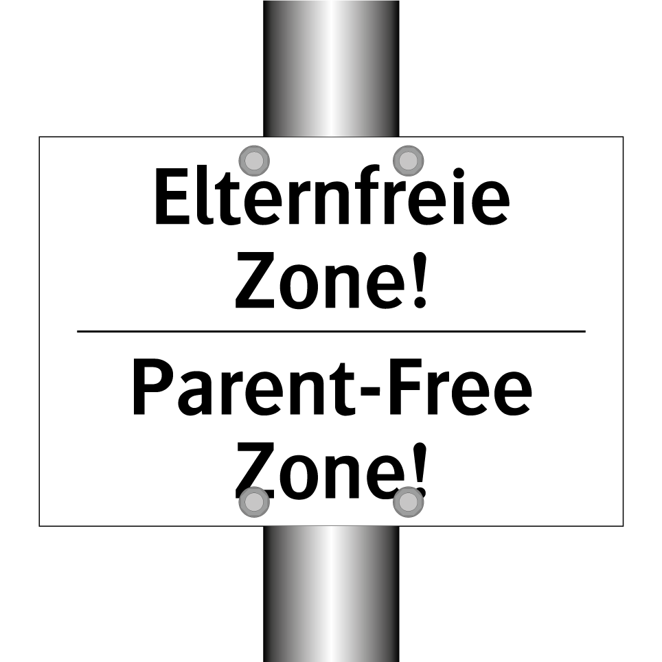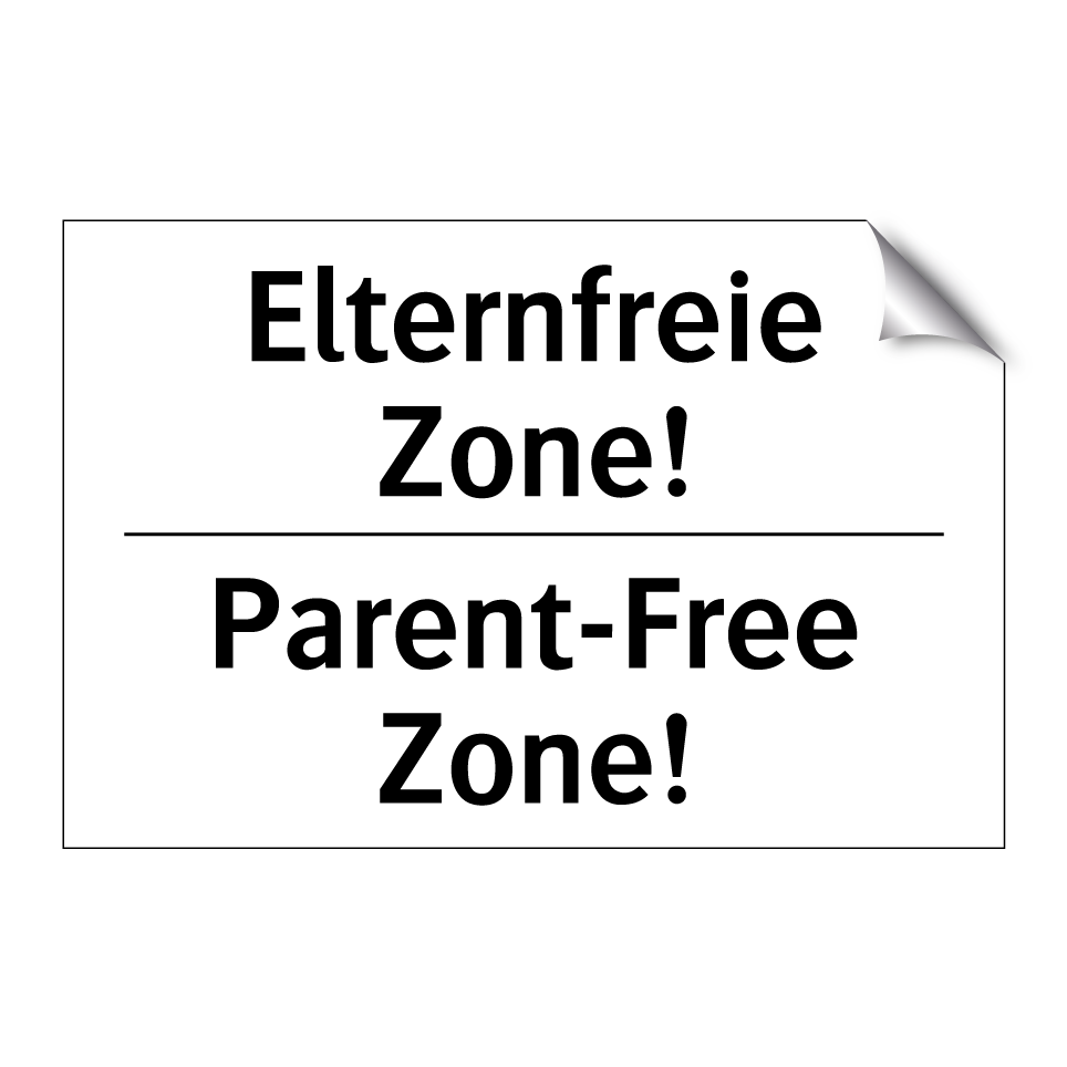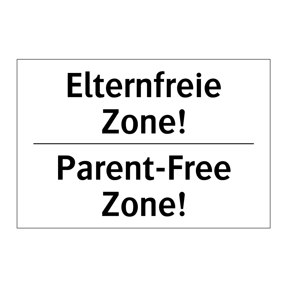 Zweisprachiges Verbotsschild mit deutschem Text Elternfreie Zone! und englischem Text Parent-Free Zone!
