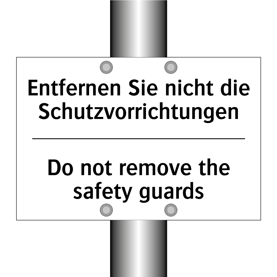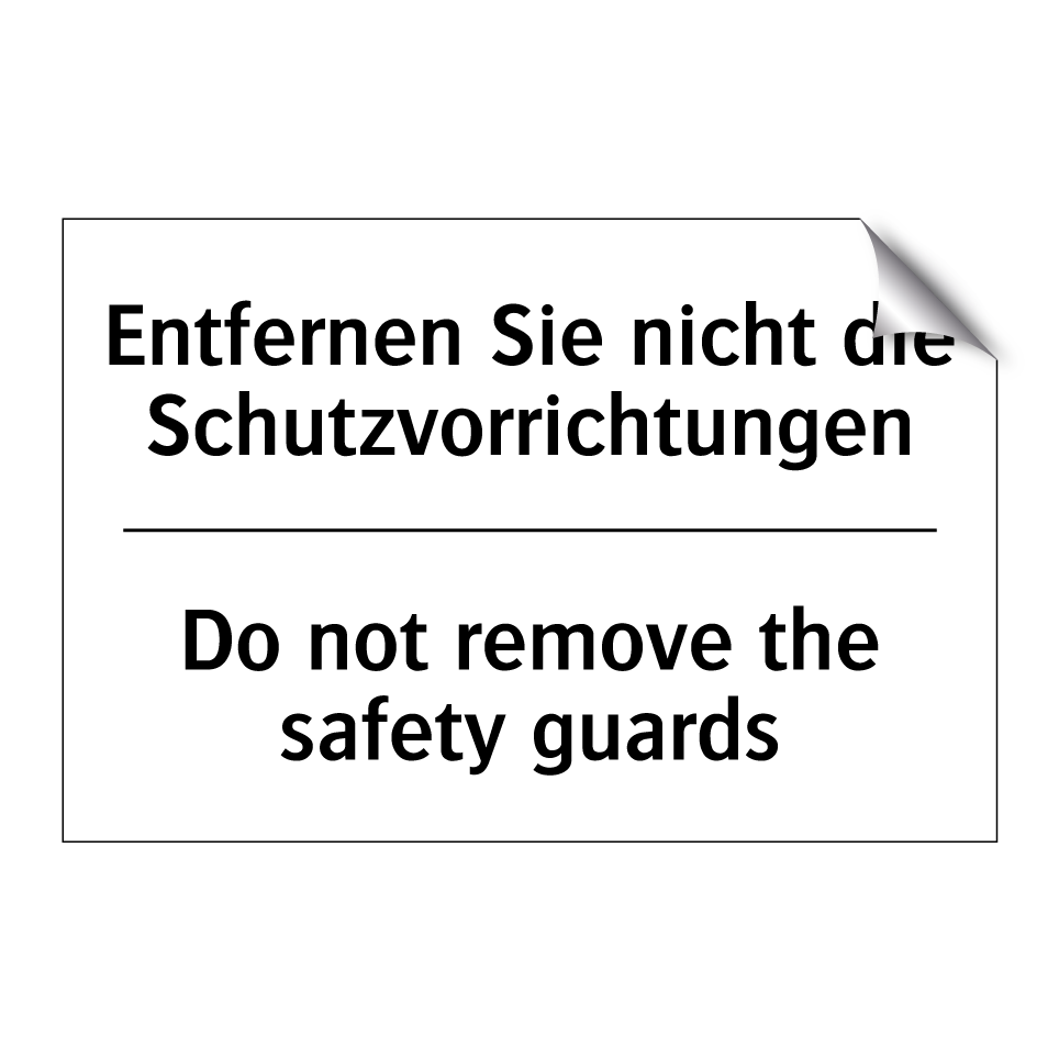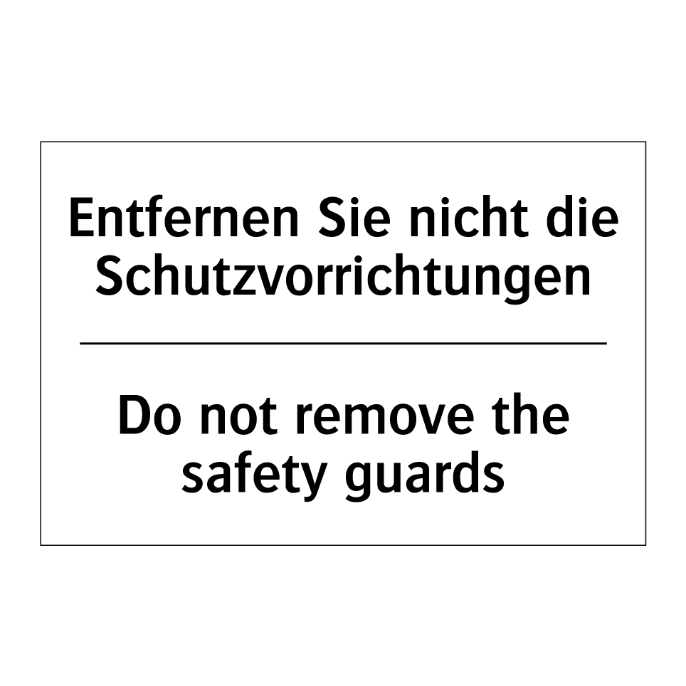 Zweisprachiges Verbotsschild mit deutschem Text Entfernen Sie nicht die Schutzvorrichtungen und englischem Text Do not remove the safety guards