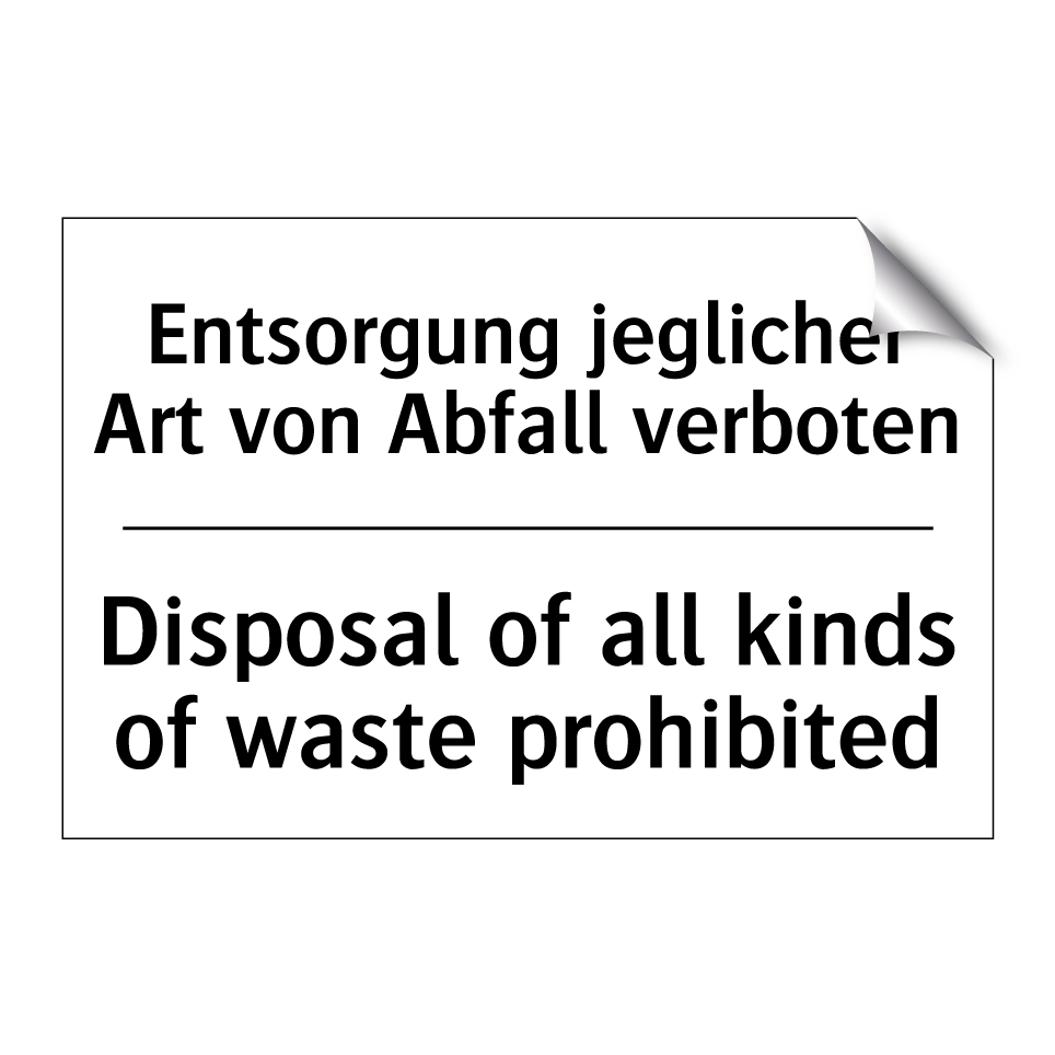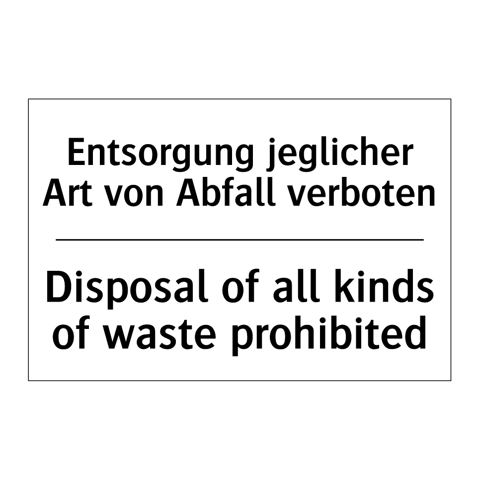 Zweisprachiges Verbotsschild mit deutschem Text Entsorgung jeglicher Art von Abfall verboten und englischem Text Disposal of all kinds of waste prohibited