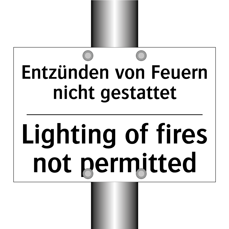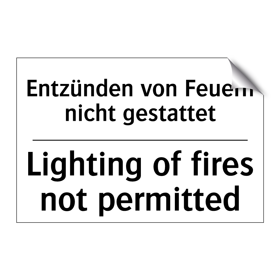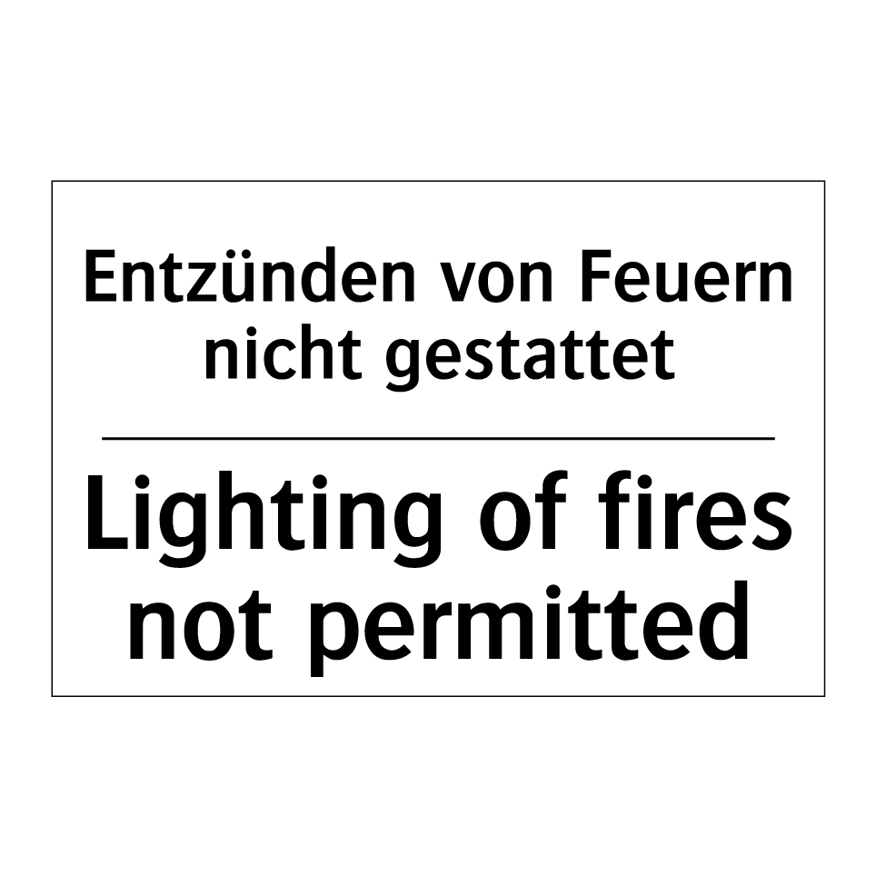 Zweisprachiges Verbotsschild mit deutschem Text Entzünden von Feuern nicht gestattet und englischem Text Lighting of fires not permitted