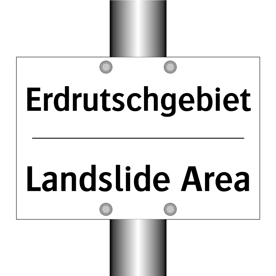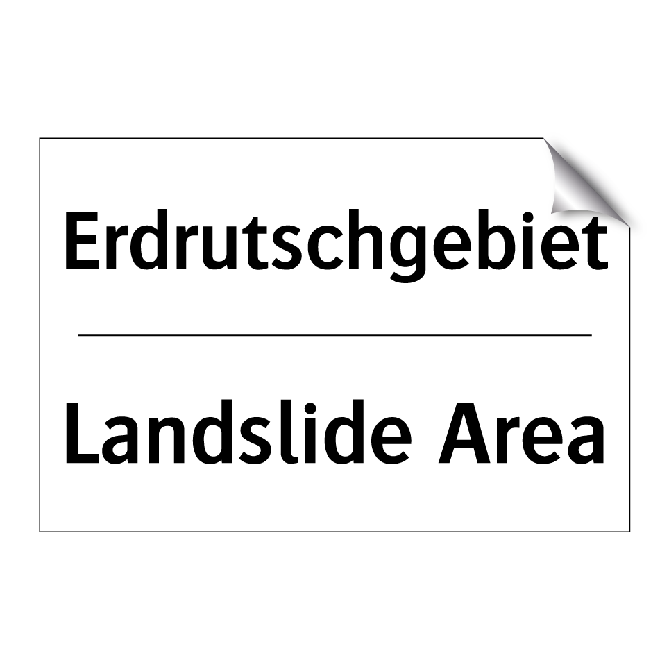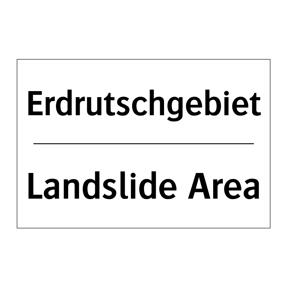 Zweisprachiges Verbotsschild mit deutschem Text Erdrutschgebiet und englischem Text Landslide Area