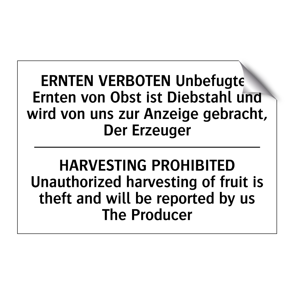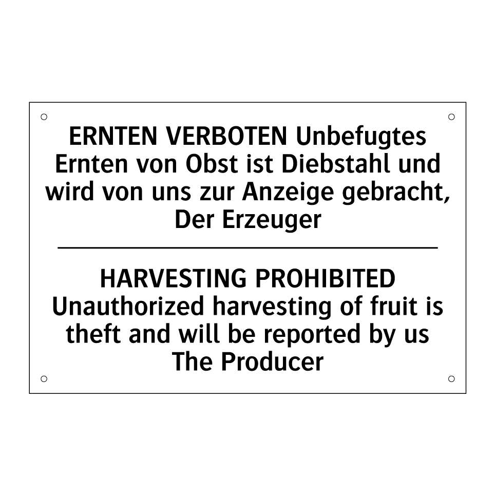 Zweisprachiges Verbotsschild mit deutschem Text ERNTEN VERBOTEN Unbefugtes Ernten von Obst ist Diebstahl und wird von uns zur Anzeige gebracht, Der Erzeuger und englischem Text HARVESTING PROHIBITED Unauthorized harvesting of fruit is theft and will be reported by us The Producer