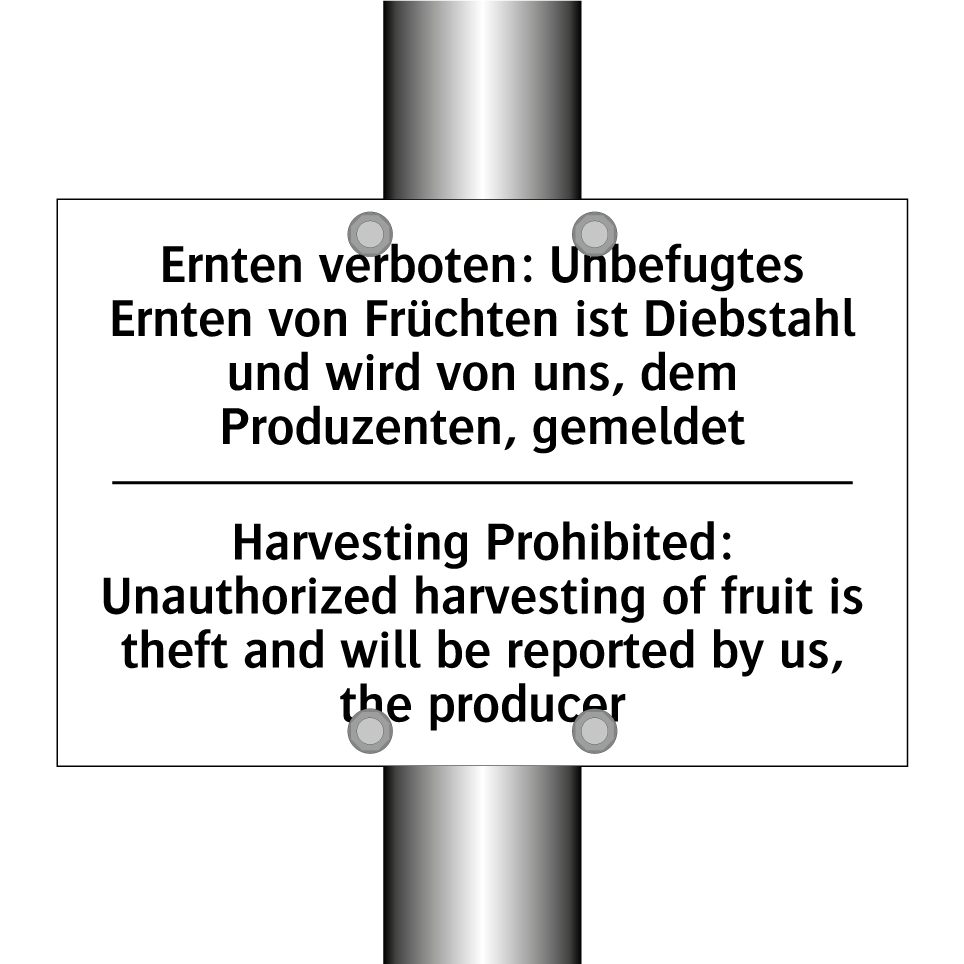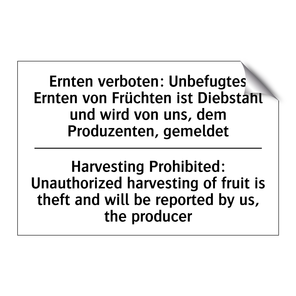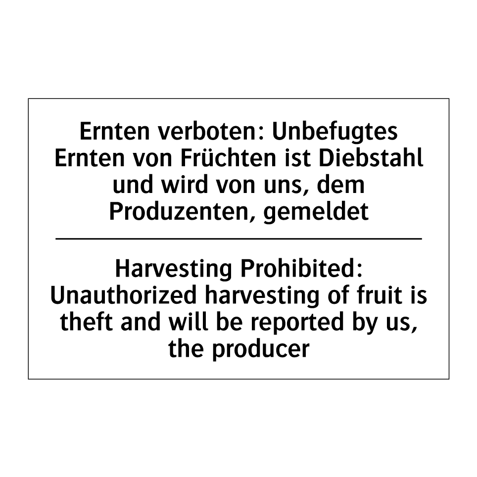 Zweisprachiges Verbotsschild mit deutschem Text Ernten verboten: Unbefugtes Ernten von Früchten ist Diebstahl und wird von uns, dem Produzenten, gemeldet und englischem Text Harvesting Prohibited: Unauthorized harvesting of fruit is theft and will be reported by us, the producer