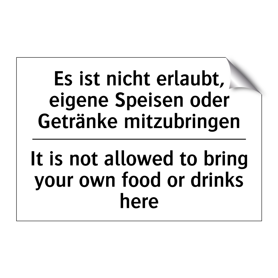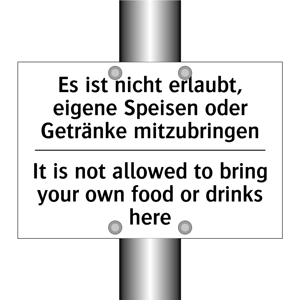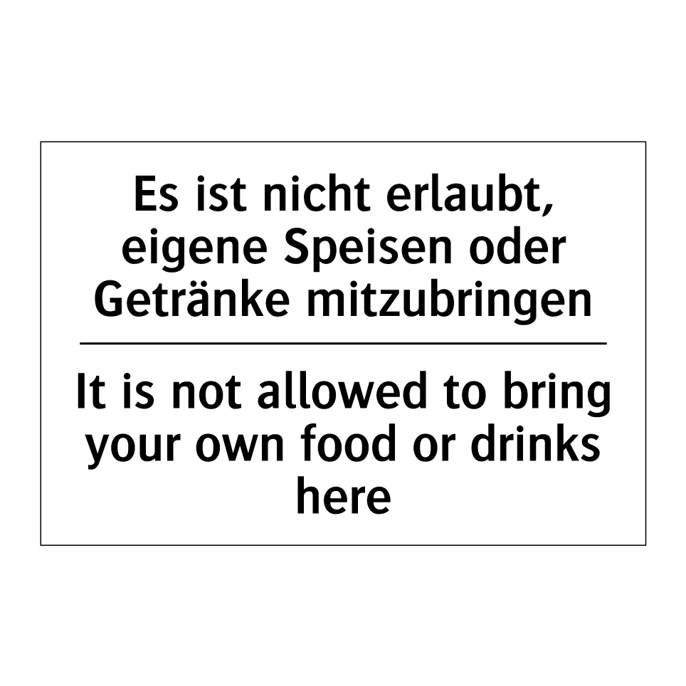 Zweisprachiges Verbotsschild mit deutschem Text Es ist nicht erlaubt, eigene Speisen oder Getränke mitzubringen und englischem Text It is not allowed to bring your own food or drinks here