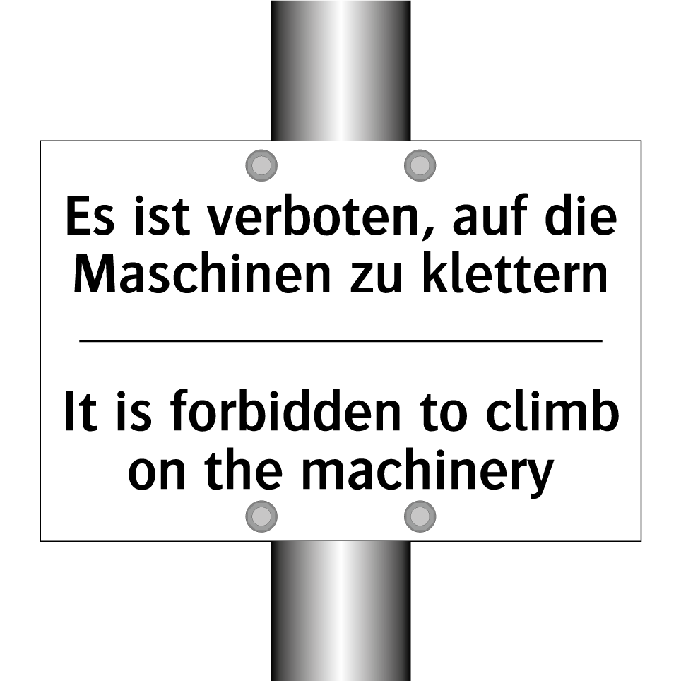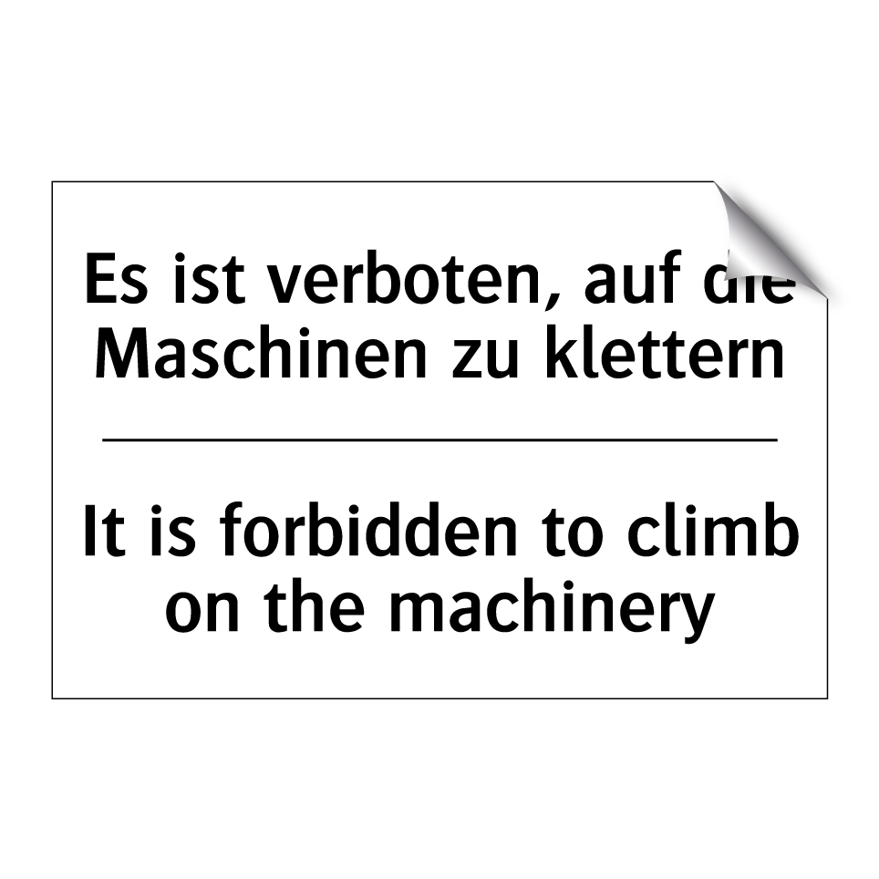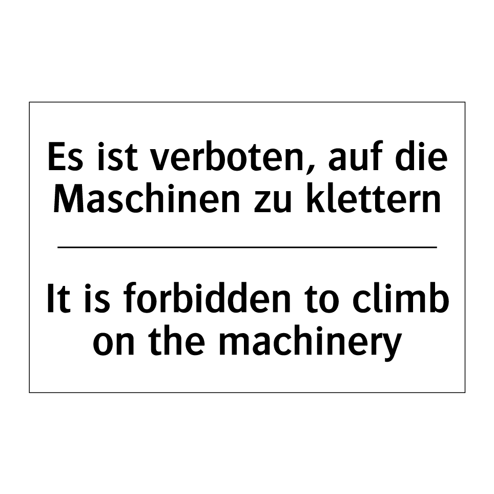 Zweisprachiges Verbotsschild mit deutschem Text Es ist verboten, auf die Maschinen zu klettern und englischem Text It is forbidden to climb on the machinery