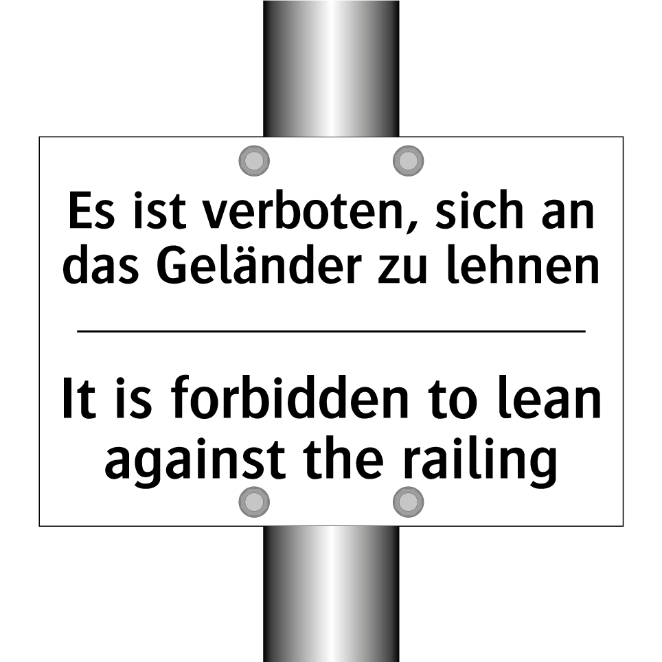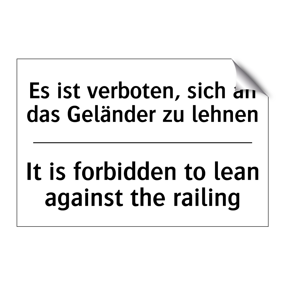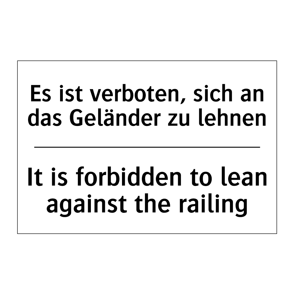 Zweisprachiges Verbotsschild mit deutschem Text Es ist verboten, sich an das Geländer zu lehnen und englischem Text It is forbidden to lean against the railing