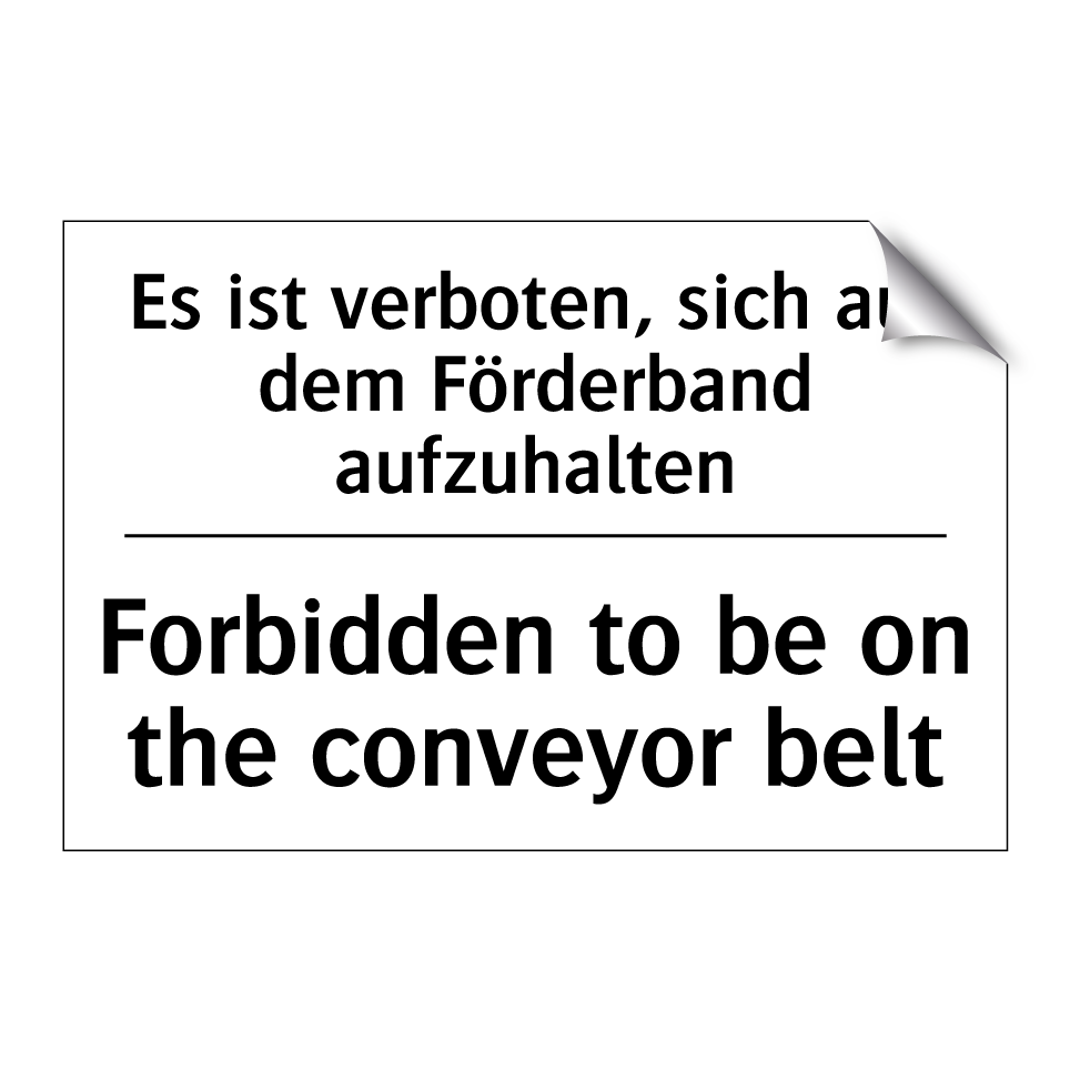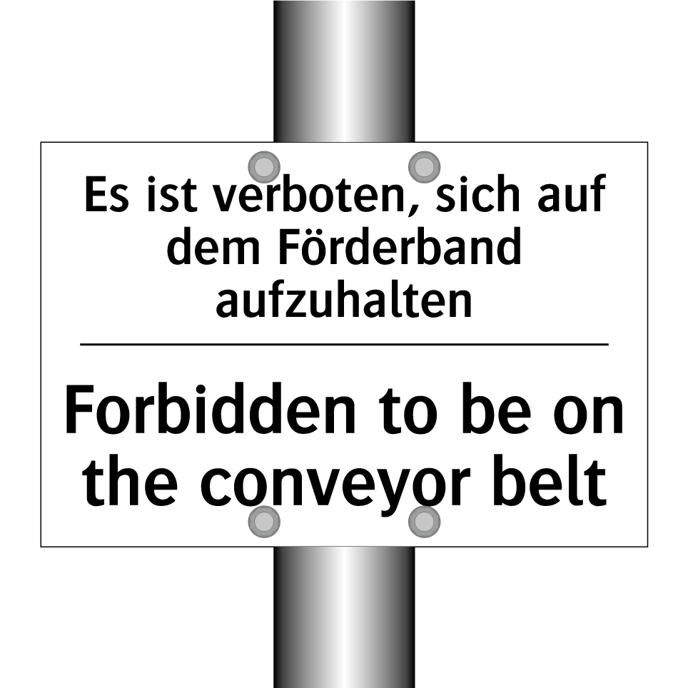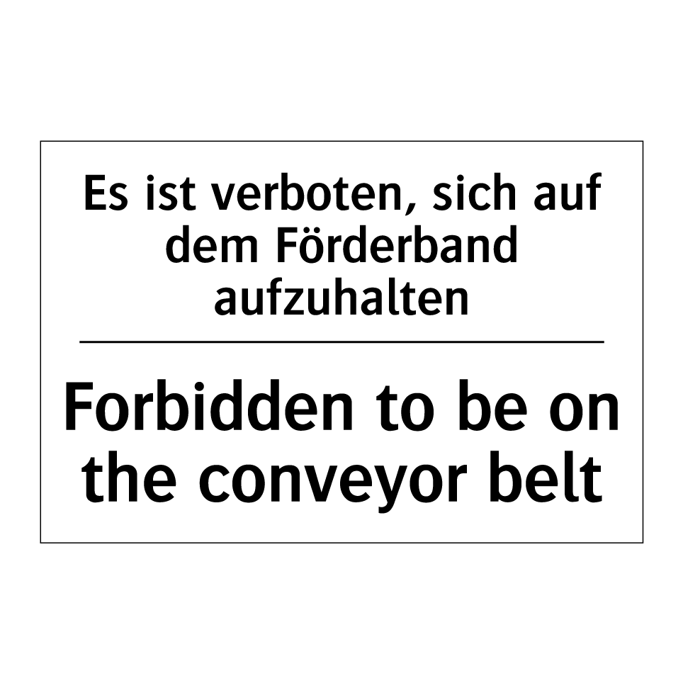 Zweisprachiges Verbotsschild mit deutschem Text Es ist verboten, sich auf dem Förderband aufzuhalten und englischem Text Forbidden to be on the conveyor belt