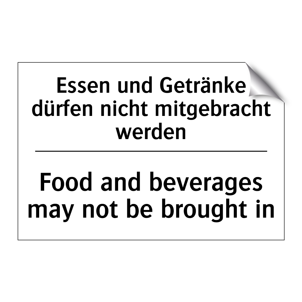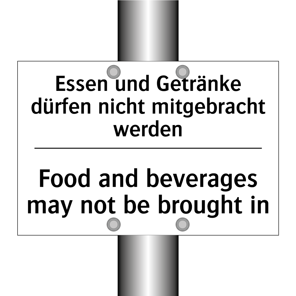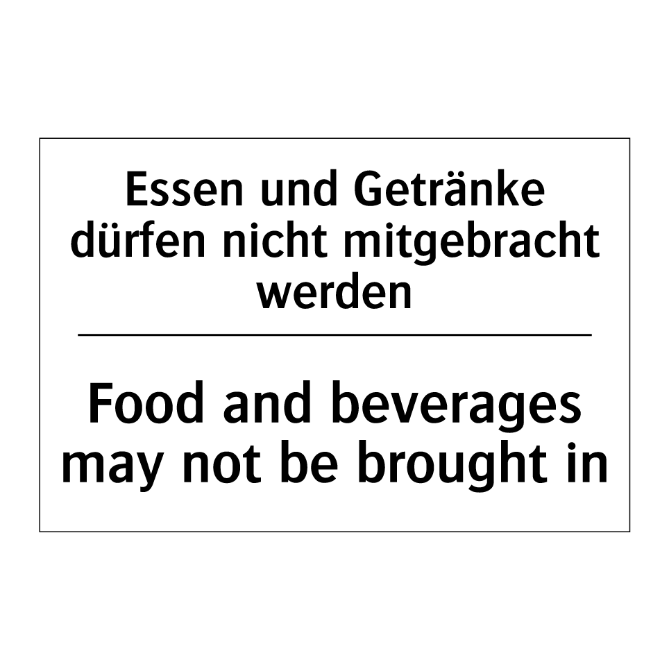 Zweisprachiges Verbotsschild mit deutschem Text Essen und Getränke dürfen nicht mitgebracht werden und englischem Text Food and beverages may not be brought in