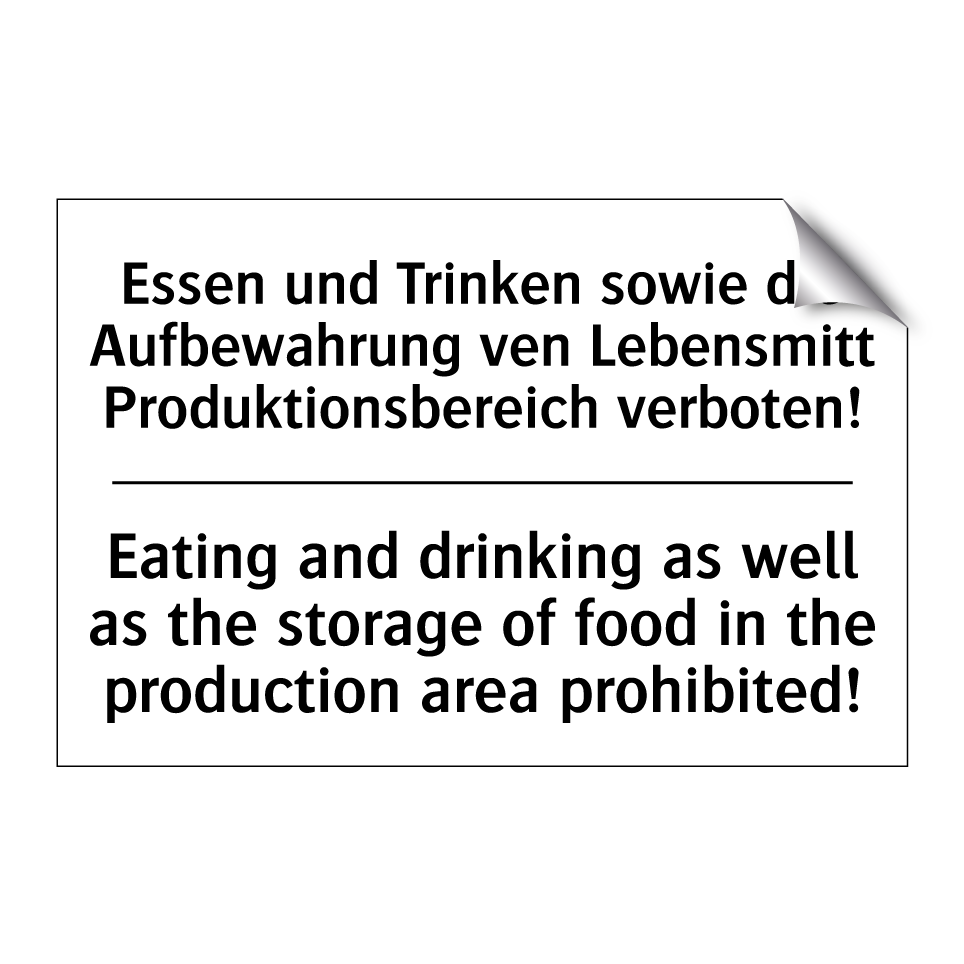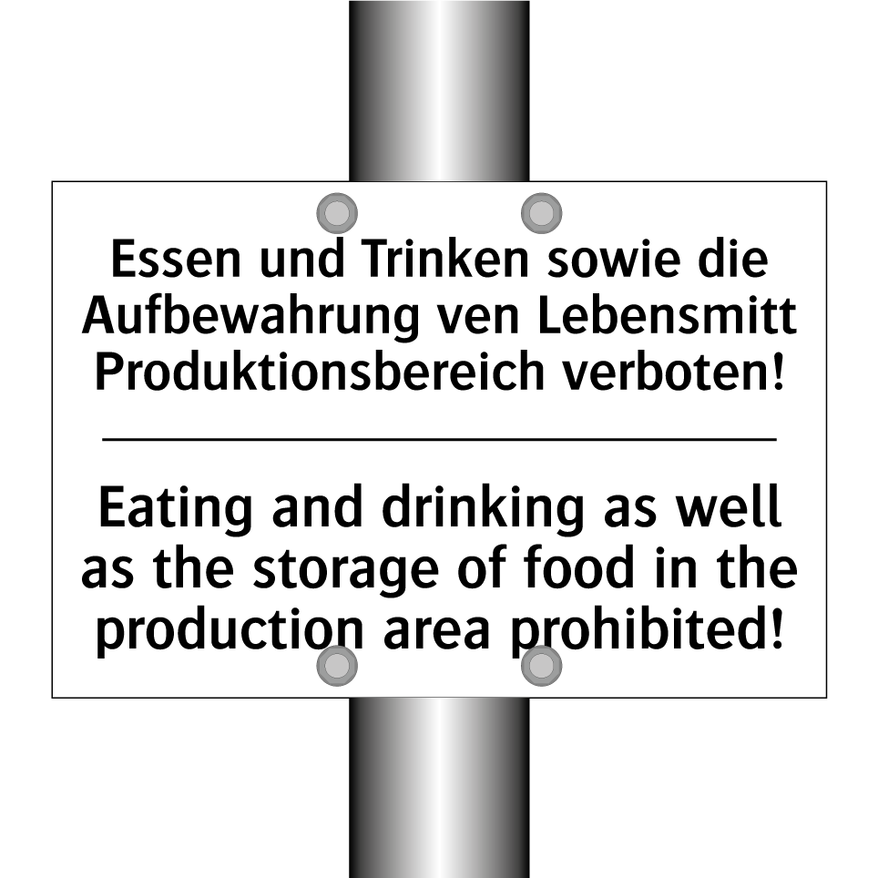 Zweisprachiges Verbotsschild mit deutschem Text Essen und Trinken sowie die Aufbewahrung ven Lebensmitt Produktionsbereich verboten! und englischem Text Eating and drinking as well as the storage of food in the production area prohibited!