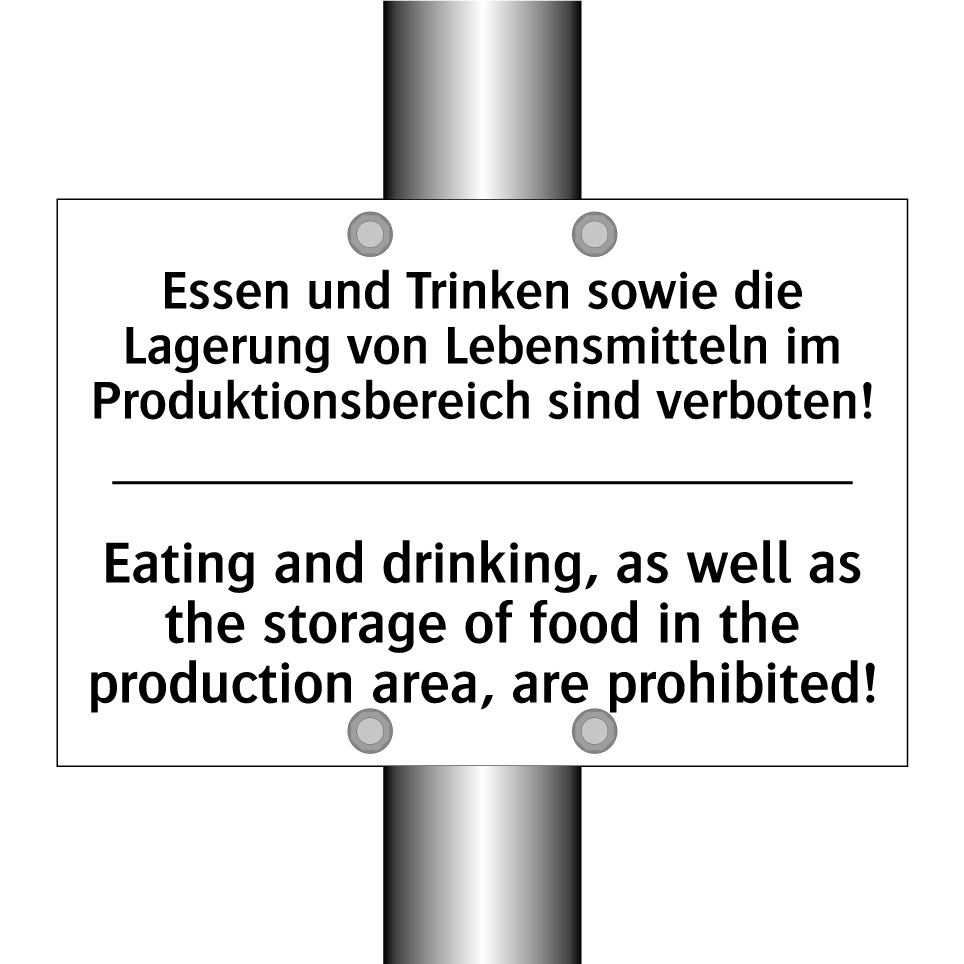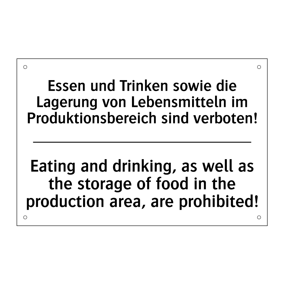Zweisprachiges Verbotsschild mit deutschem Text Essen und Trinken sowie die Lagerung von Lebensmitteln im Produktionsbereich sind verboten! und englischem Text Eating and drinking, as well as the storage of food in the production area, are prohibited!
