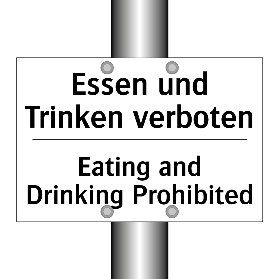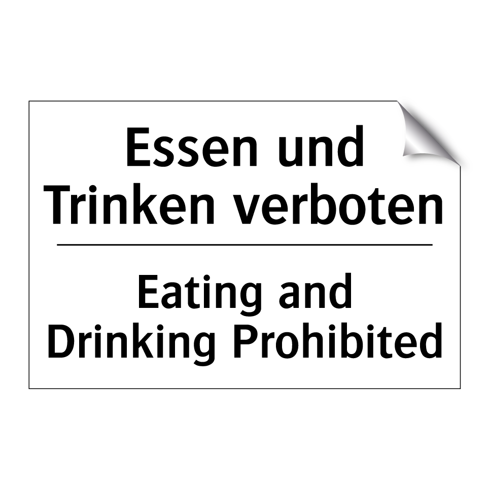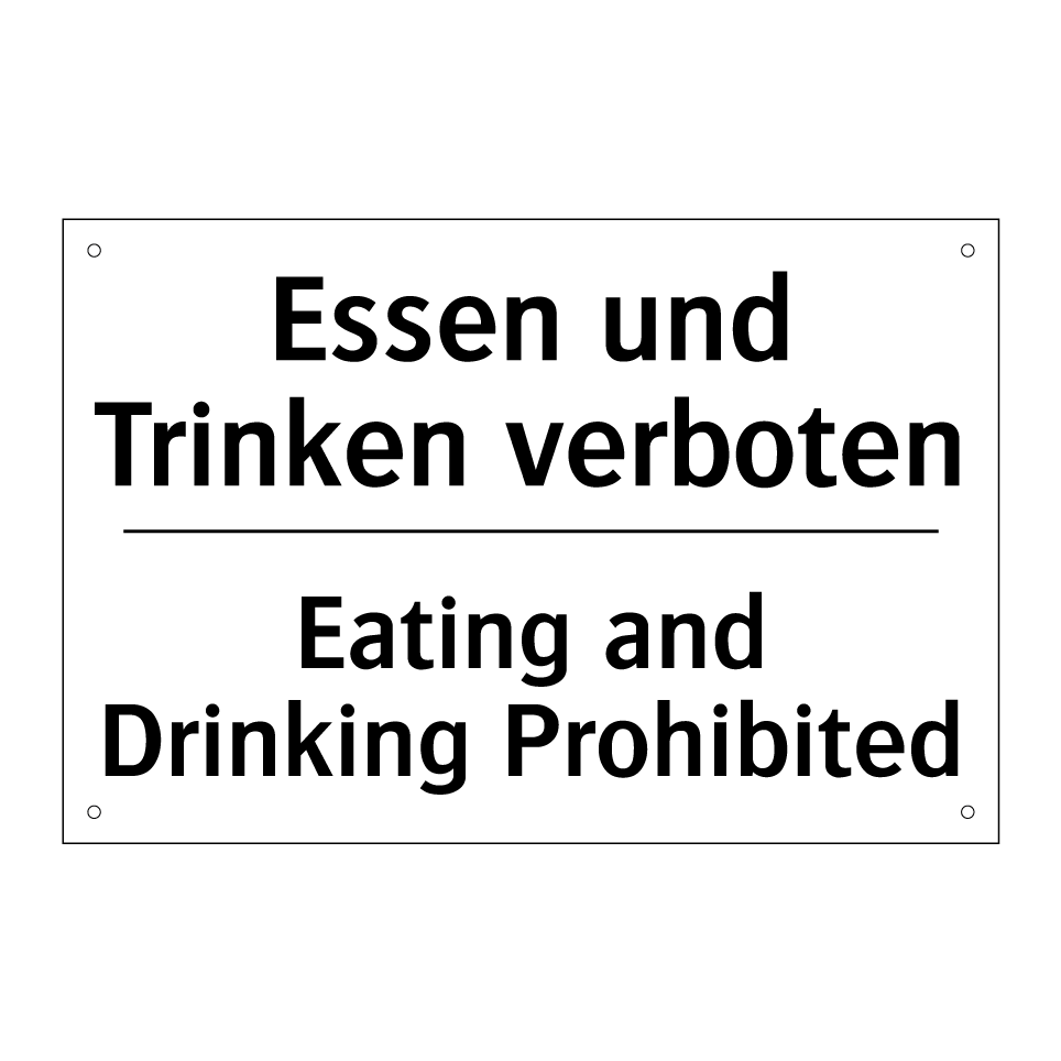 Zweisprachiges Verbotsschild mit deutschem Text Essen und Trinken verboten und englischem Text Eating and Drinking Prohibited
