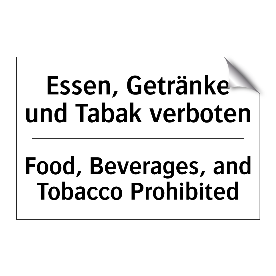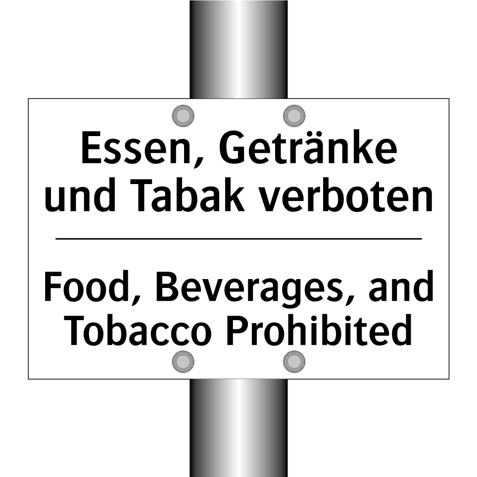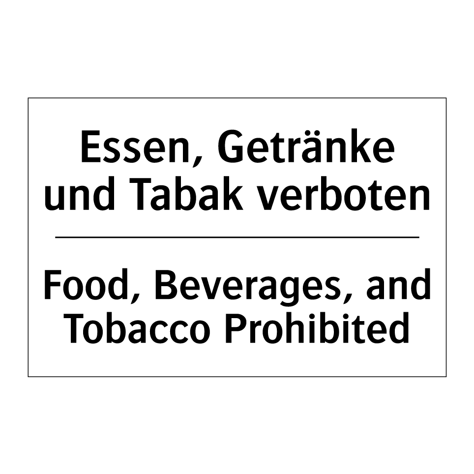 Zweisprachiges Verbotsschild mit deutschem Text Essen, Getränke und Tabak verboten und englischem Text Food, Beverages, and Tobacco Prohibited