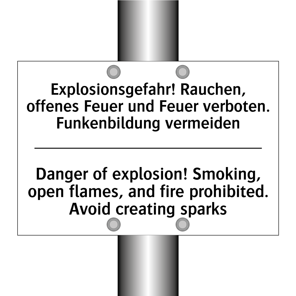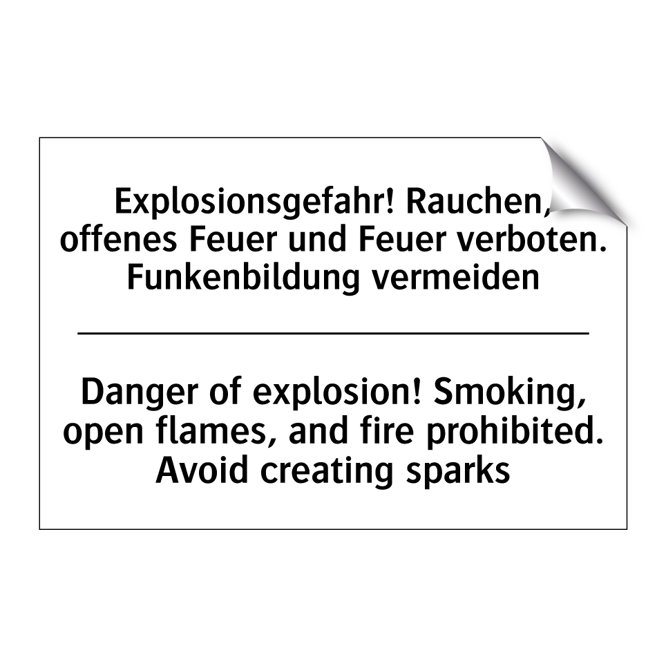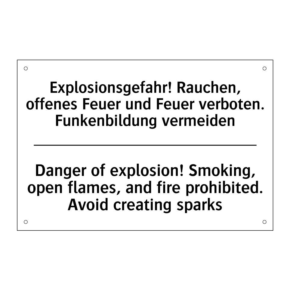 Zweisprachiges Verbotsschild mit deutschem Text Explosionsgefahr! Rauchen, offenes Feuer und Feuer verboten. Funkenbildung vermeiden und englischem Text Danger of explosion! Smoking, open flames, and fire prohibited. Avoid creating sparks