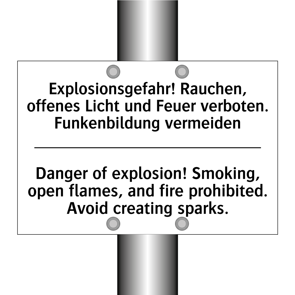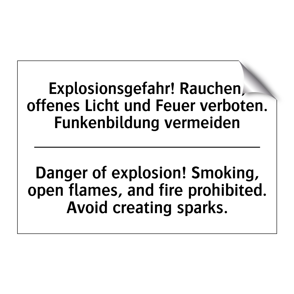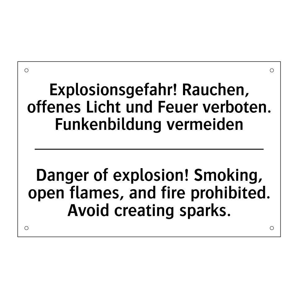 Zweisprachiges Verbotsschild mit deutschem Text Explosionsgefahr! Rauchen, offenes Licht und Feuer verboten. Funkenbildung vermeiden und englischem Text Danger of explosion! Smoking, open flames, and fire prohibited. Avoid creating sparks.