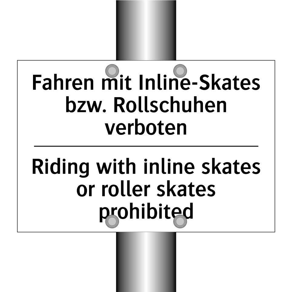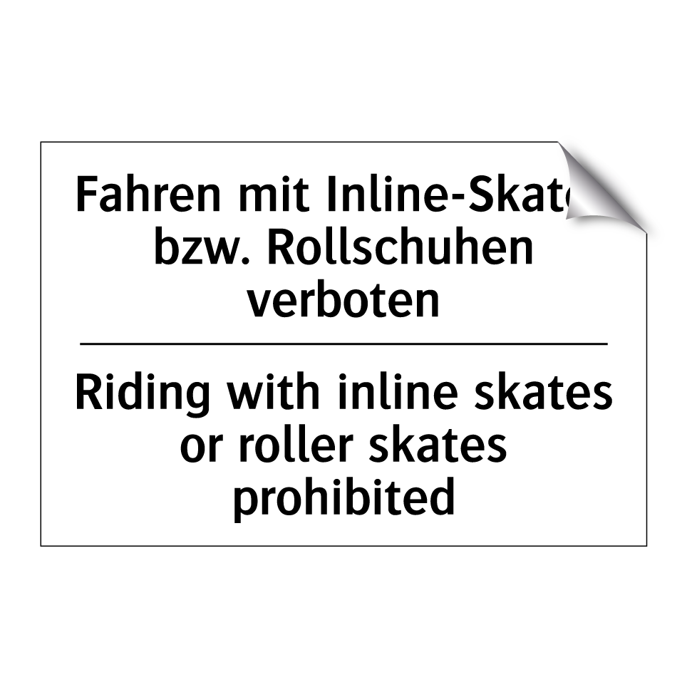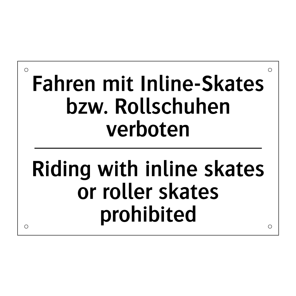 Zweisprachiges Verbotsschild mit deutschem Text Fahren mit Inline-Skates bzw. Rollschuhen verboten und englischem Text Riding with inline skates or roller skates prohibited