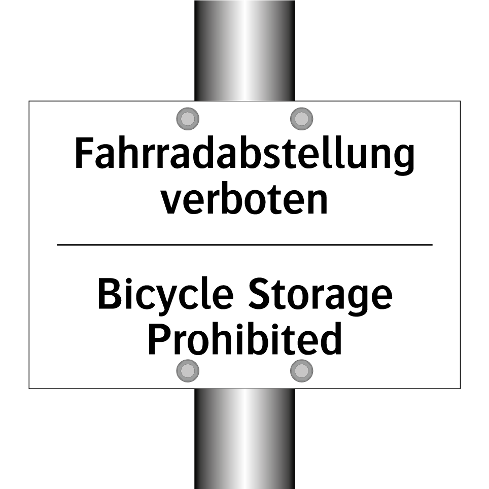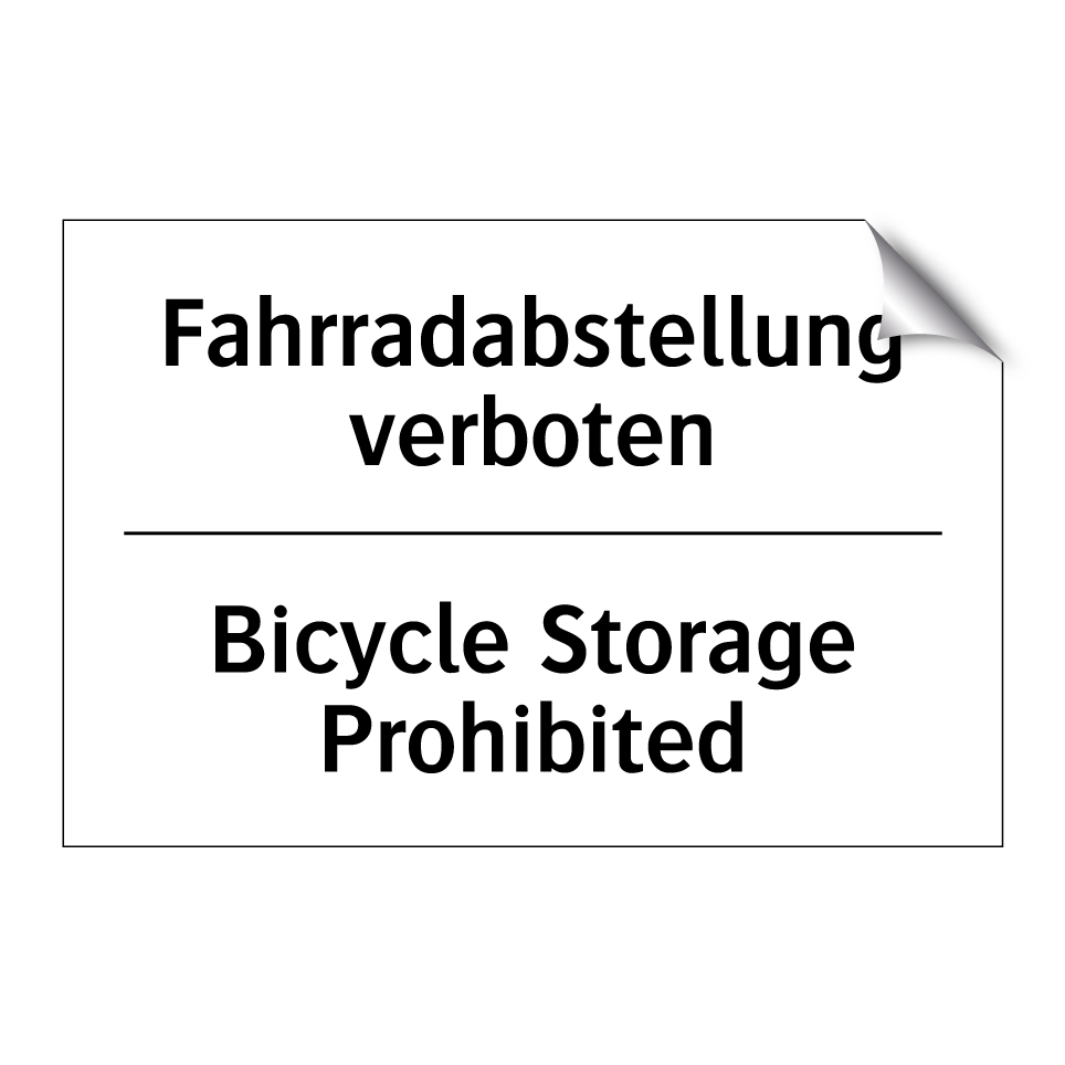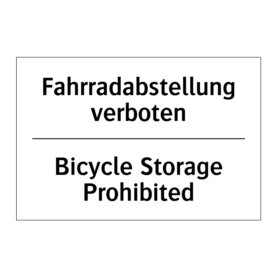 Zweisprachiges Verbotsschild mit deutschem Text Fahrradabstellung verboten und englischem Text Bicycle Storage Prohibited