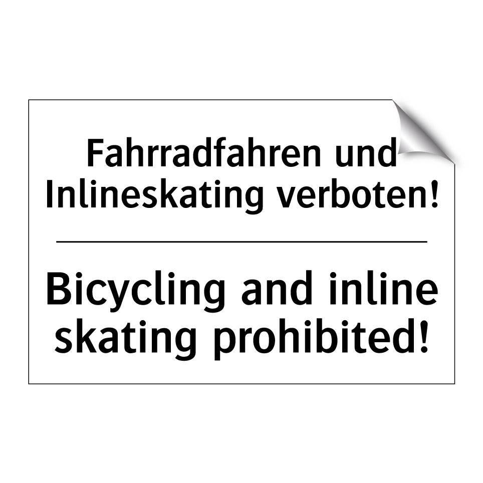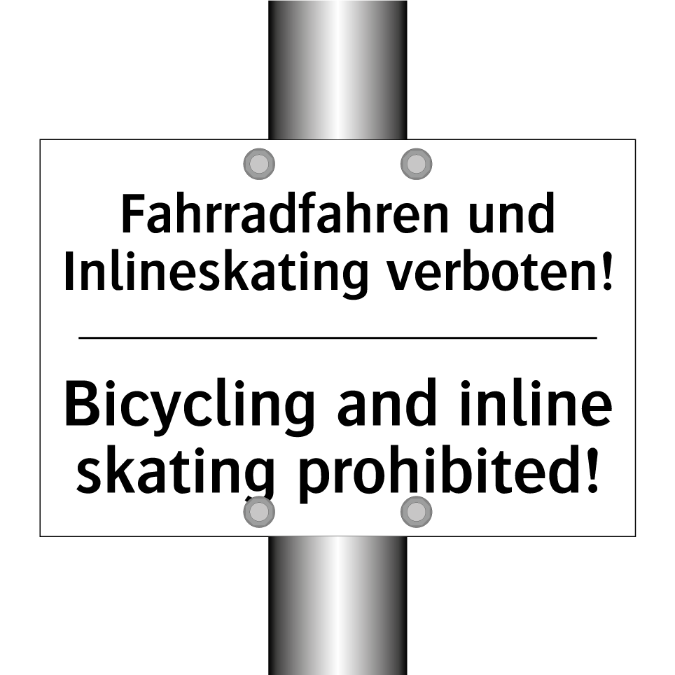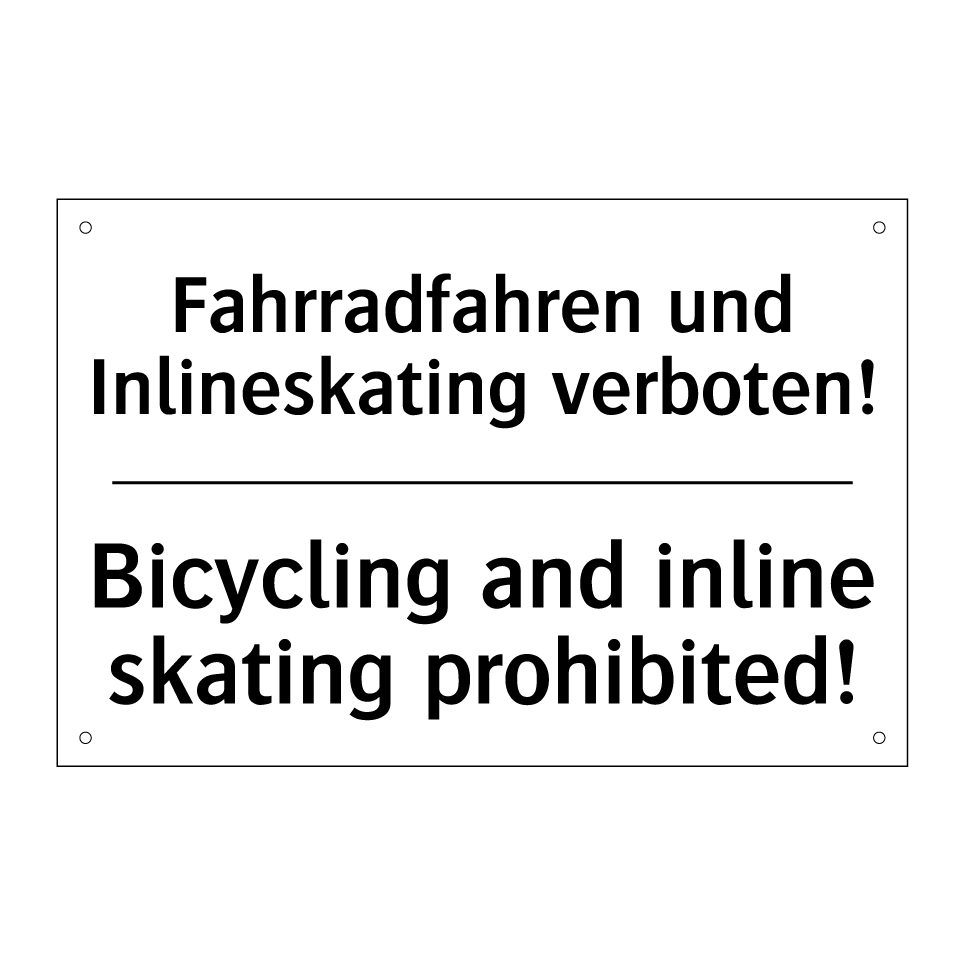 Zweisprachiges Verbotsschild mit deutschem Text Fahrradfahren und Inlineskating verboten! und englischem Text Bicycling and inline skating prohibited!