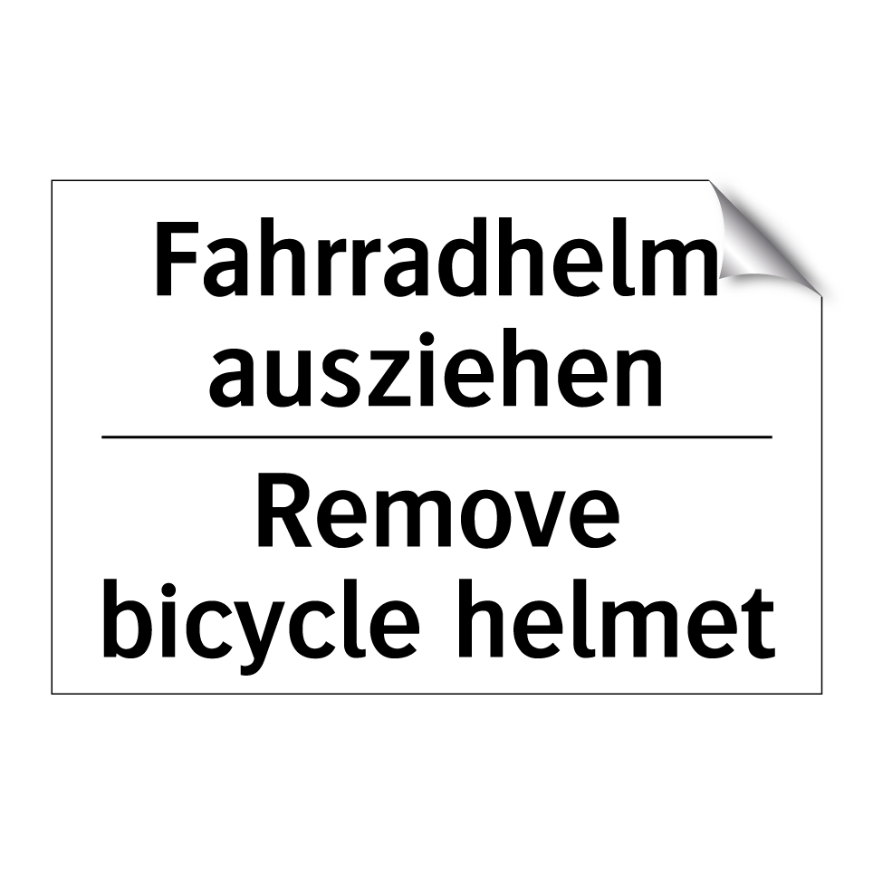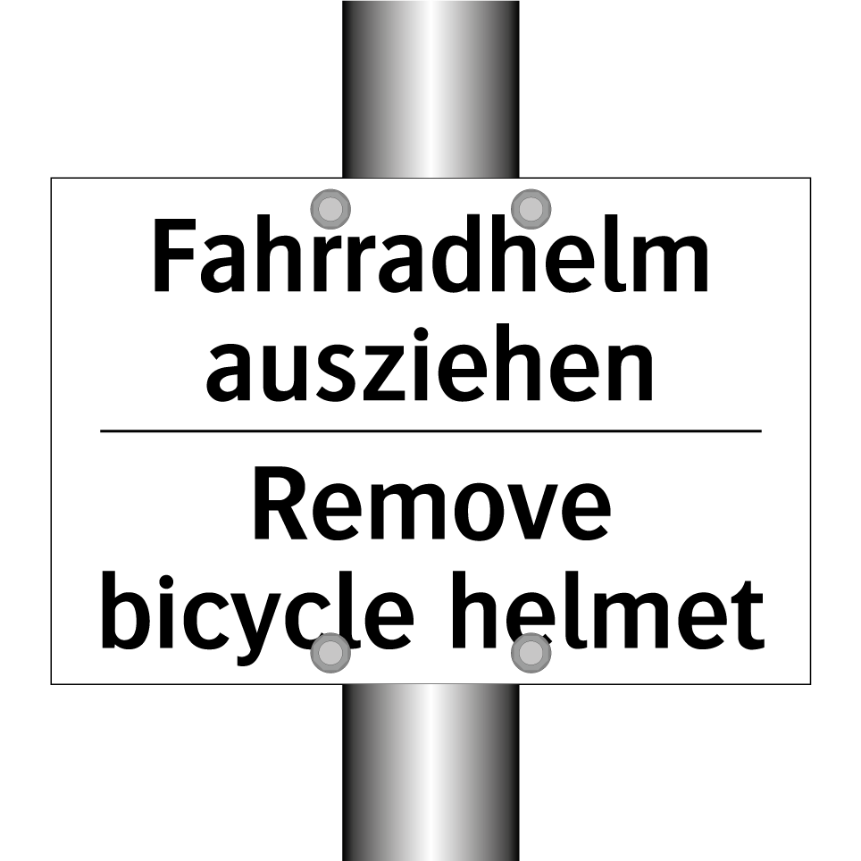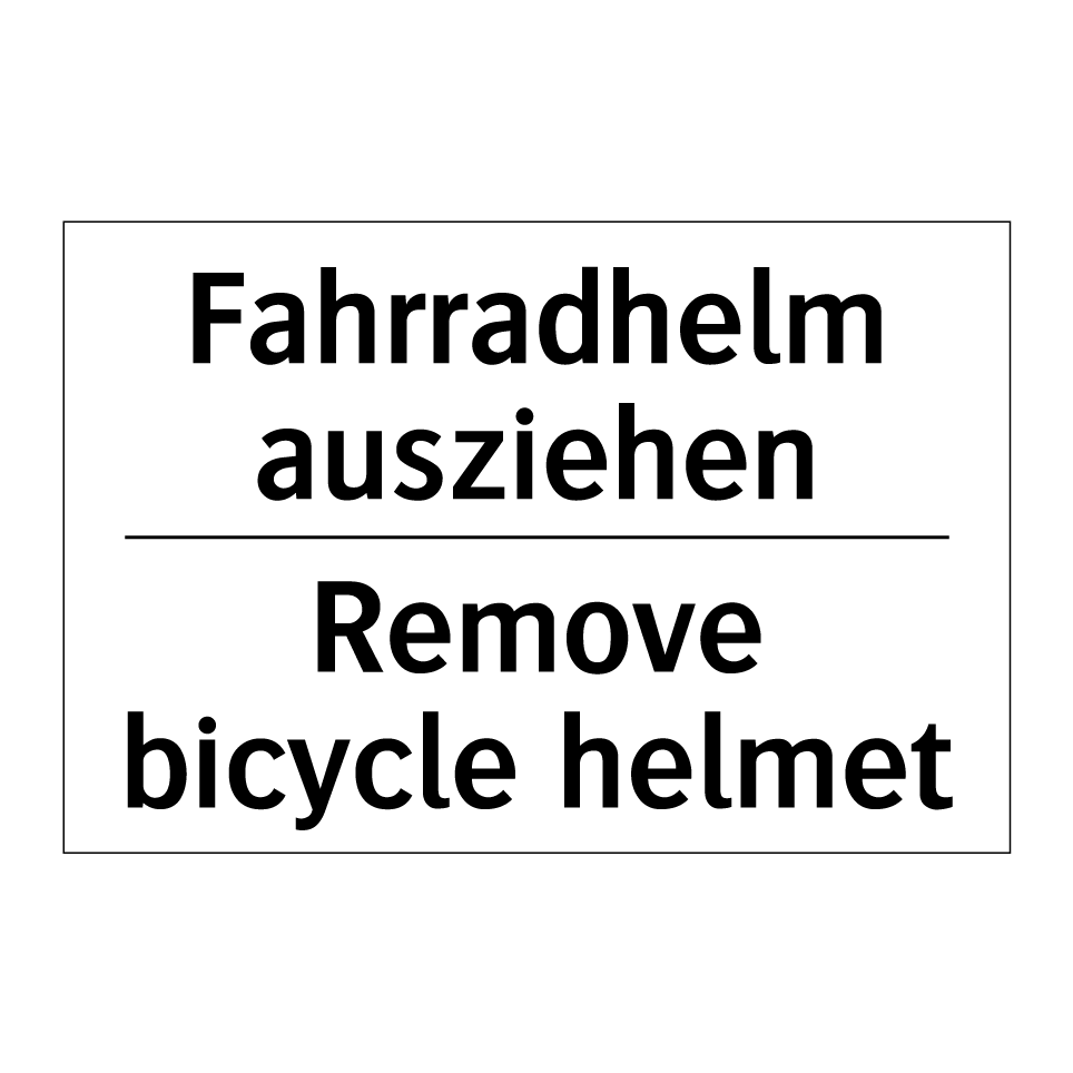 Zweisprachiges Verbotsschild mit deutschem Text Fahrradhelm ausziehen und englischem Text Remove bicycle helmet