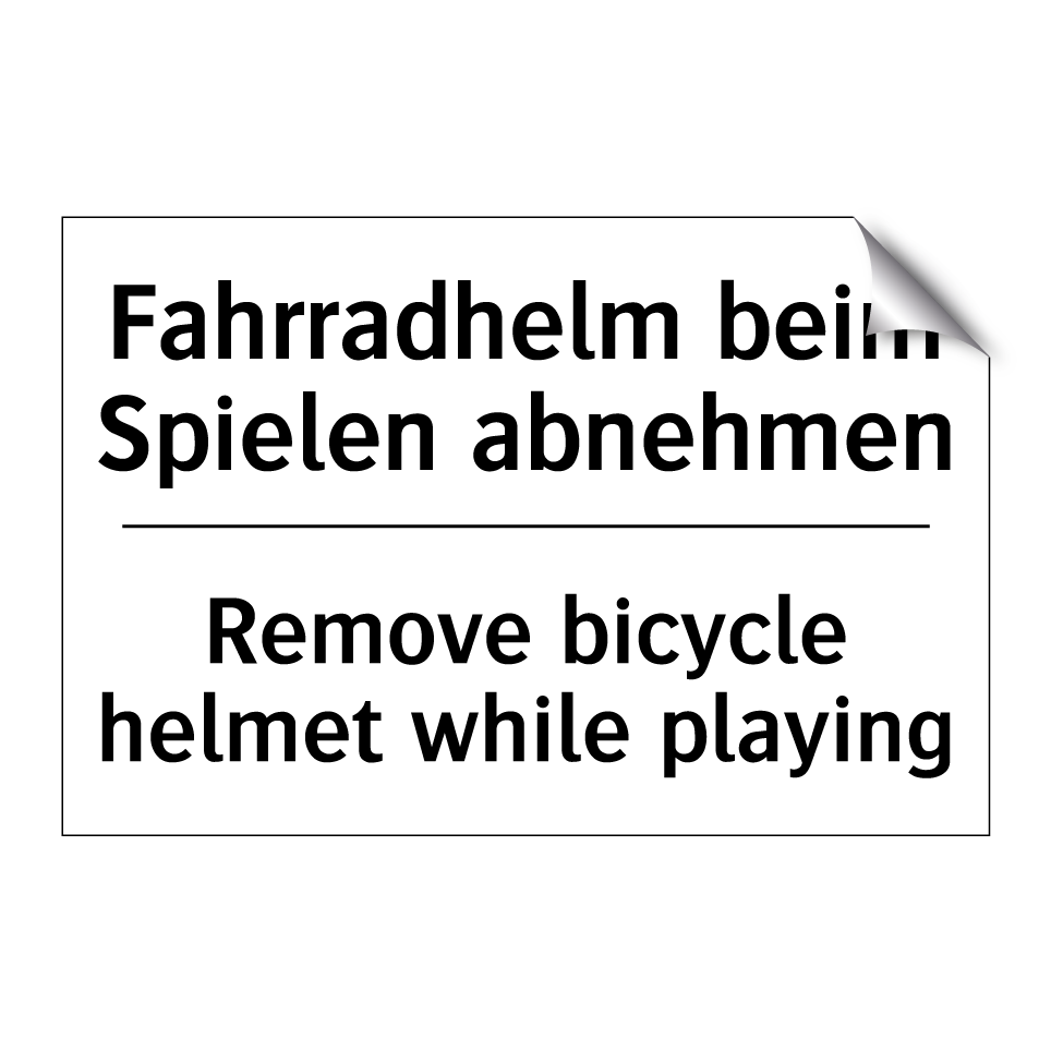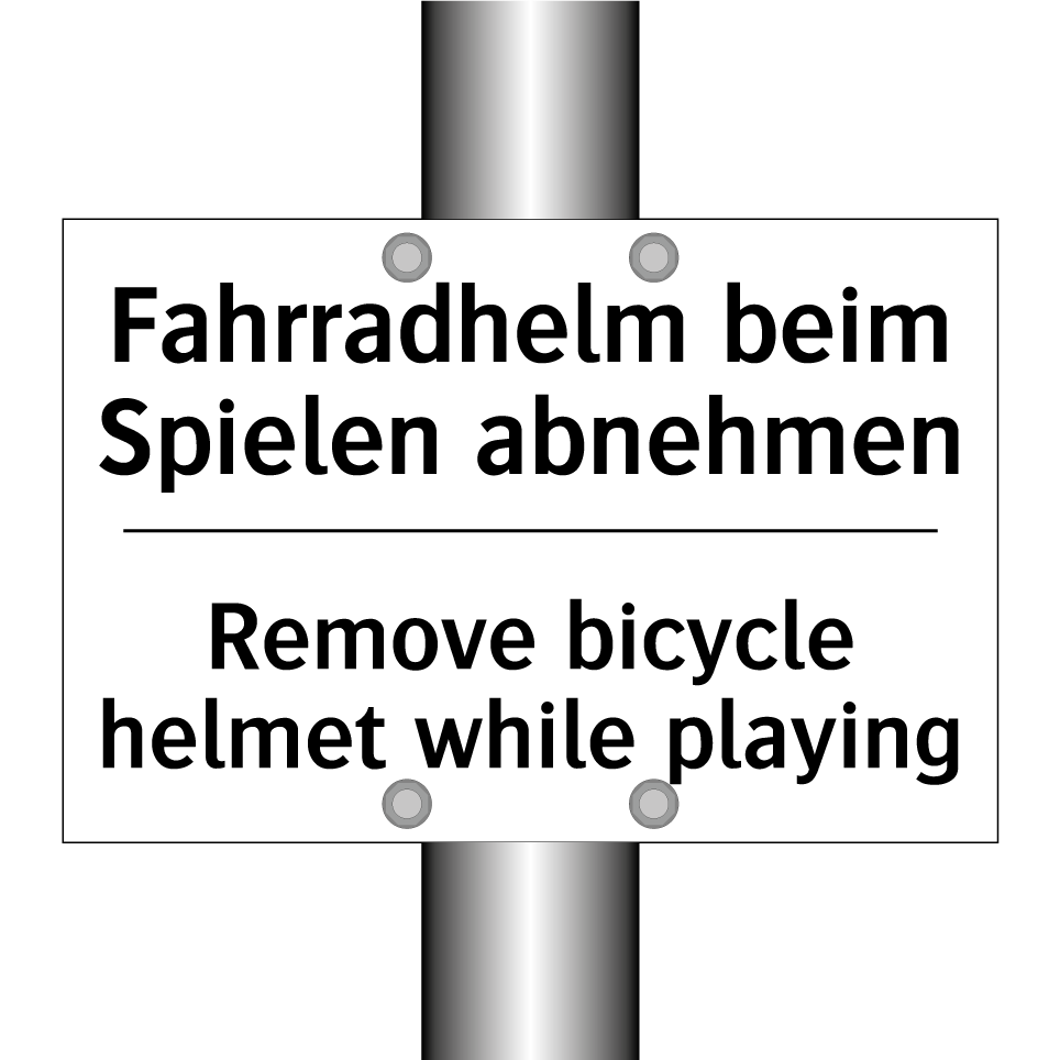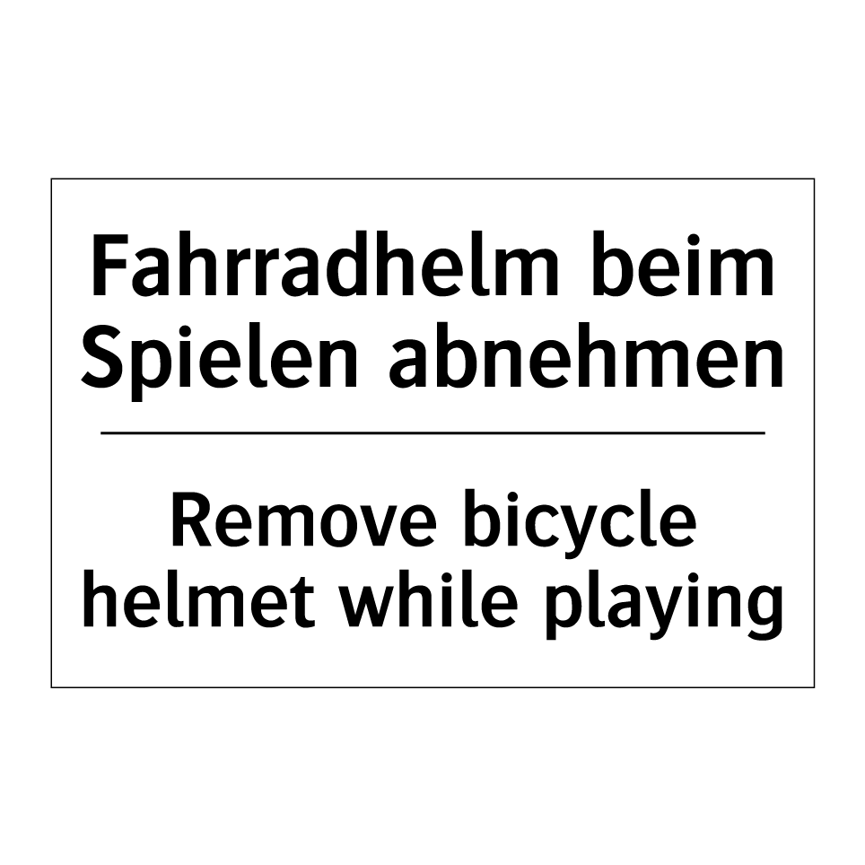 Zweisprachiges Verbotsschild mit deutschem Text Fahrradhelm beim Spielen abnehmen und englischem Text Remove bicycle helmet while playing