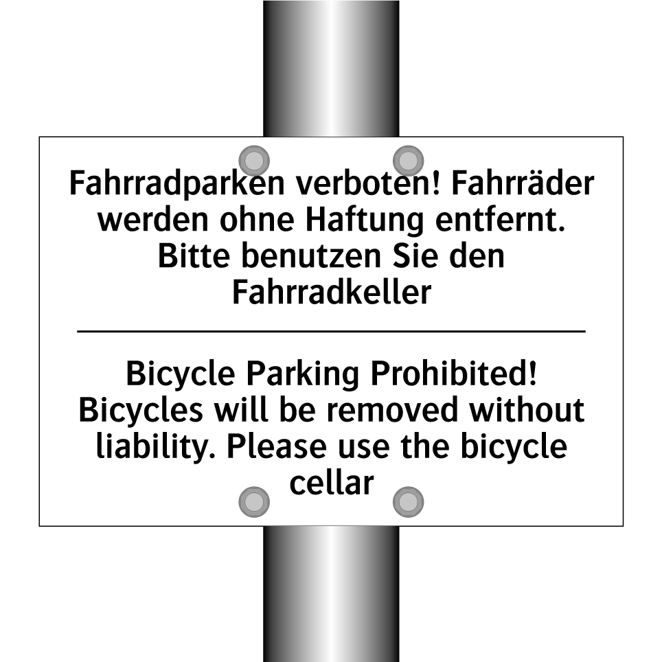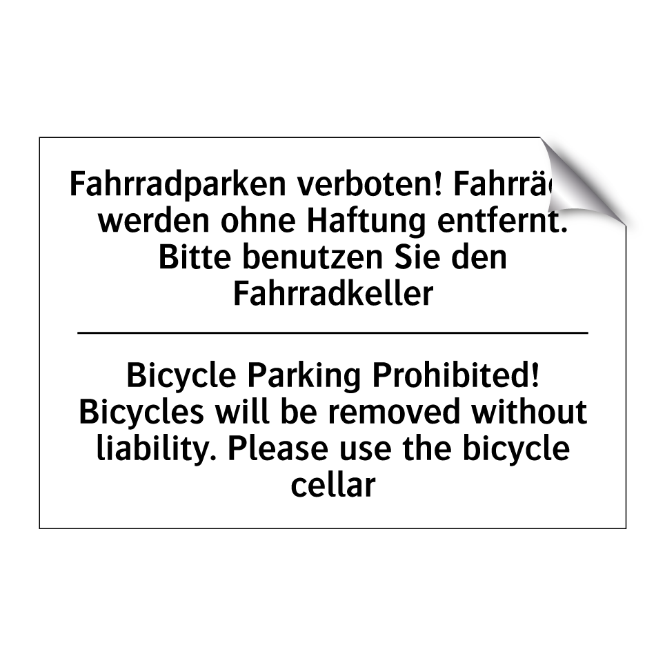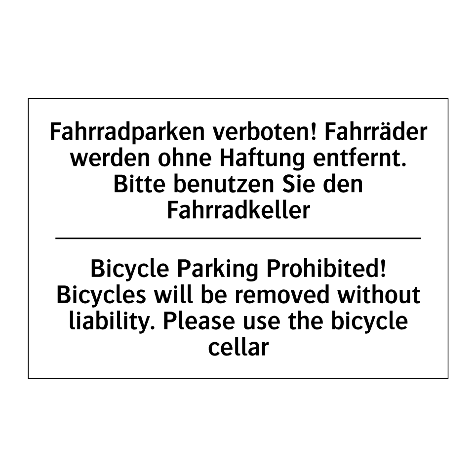 Zweisprachiges Verbotsschild mit deutschem Text Fahrradparken verboten! Fahrräder werden ohne Haftung entfernt. Bitte benutzen Sie den Fahrradkeller und englischem Text Bicycle Parking Prohibited! Bicycles will be removed without liability. Please use the bicycle cellar