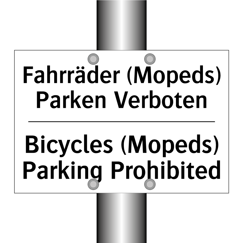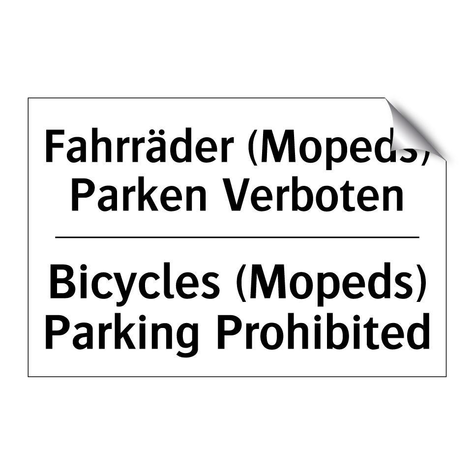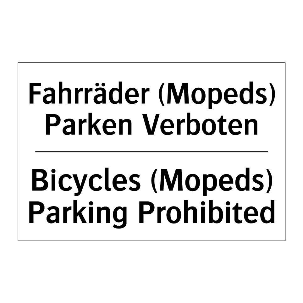 Zweisprachiges Verbotsschild mit deutschem Text Fahrräder (Mopeds) Parken Verboten und englischem Text Bicycles (Mopeds) Parking Prohibited