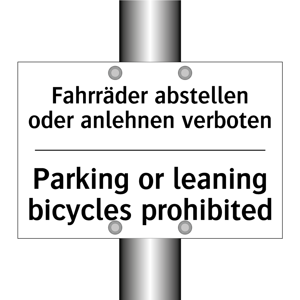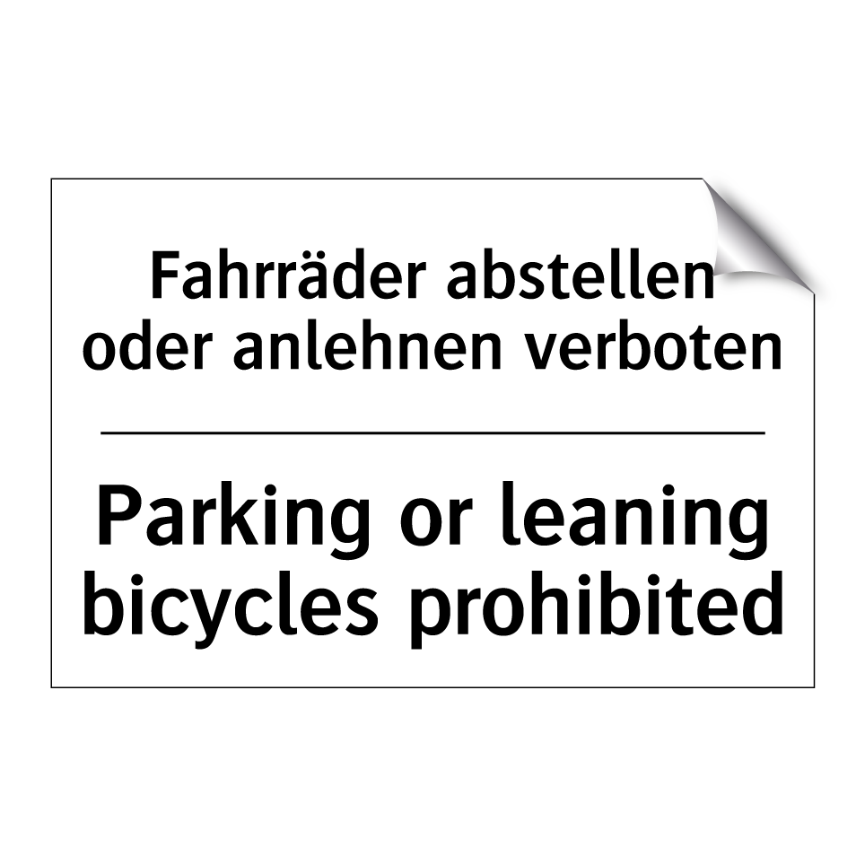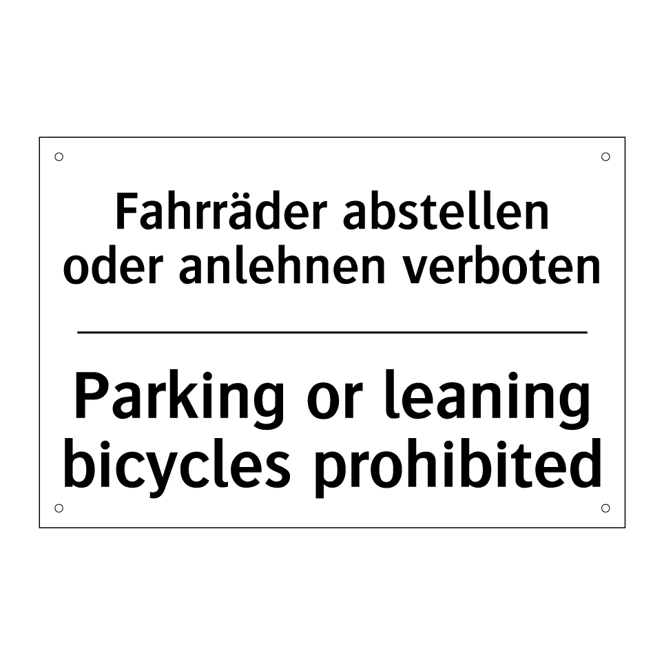Zweisprachiges Verbotsschild mit deutschem Text Fahrräder abstellen oder anlehnen verboten und englischem Text Parking or leaning bicycles prohibited